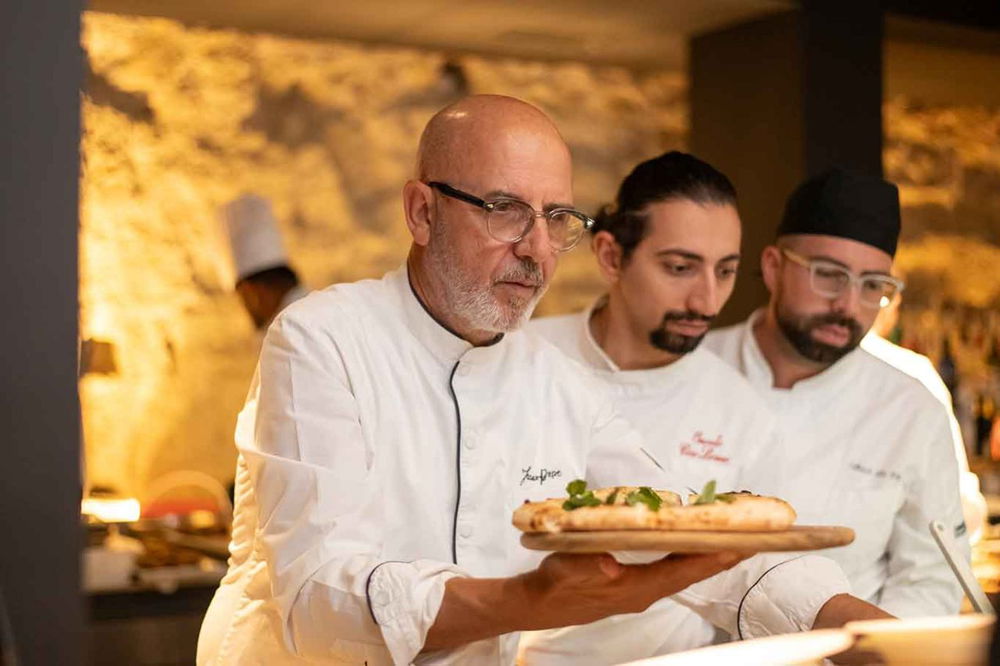Franco Pepe, Pepe in Grani a Caiazzo – L’incontro Alfonso e Franco: La pinsa “conciata” e fichi. La pizza per Notte di Stelle 2025 è quella pèresentata al Don Alfonso 1890 nel 2011.