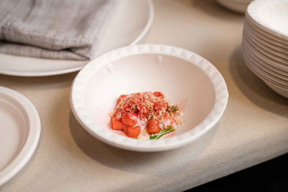 Antonio Iacoviello, Castello di Spaltenna a Gaiole in Chianti – Il Vesuvio visto da Kagoshima. Tubetti rigati freddi fragole fermentate e pomodoro del Vesuvio maionese allo yuzu kosho e mozzarella acida con bouquet di erbe.