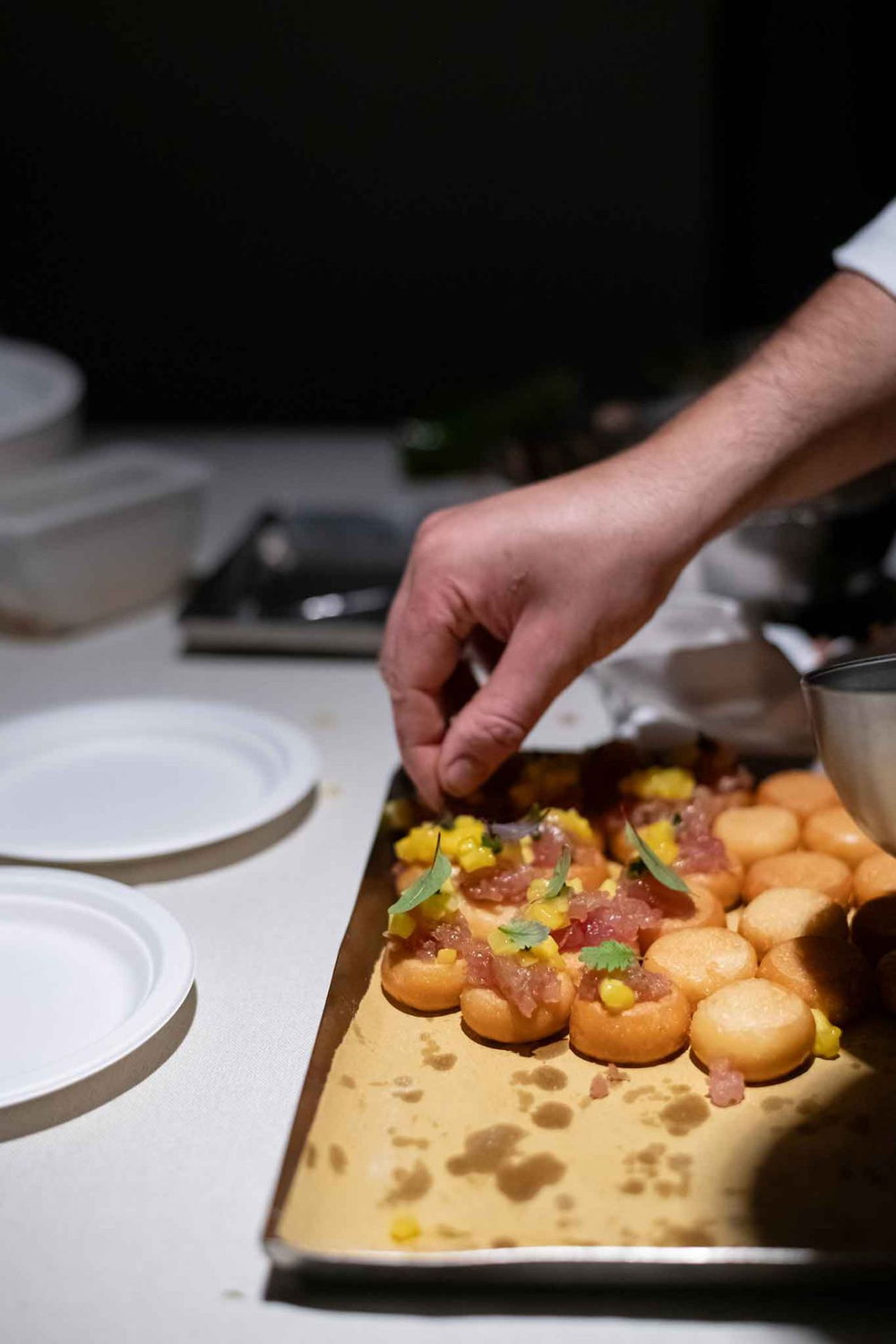 Gennaro Esposito, La Torre del Saracino a Vico Equense – Croccante di riso con tonno e mango.