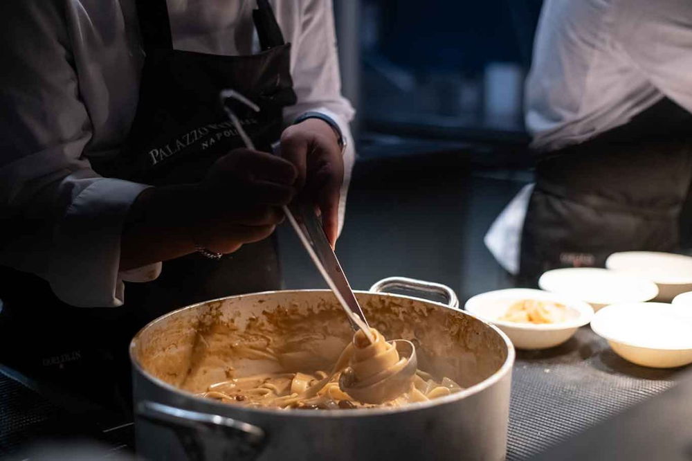 Lino Scarallo, Palazzo Petrucci a Napoli – Nastri con cozze, finferli e pane conciato.