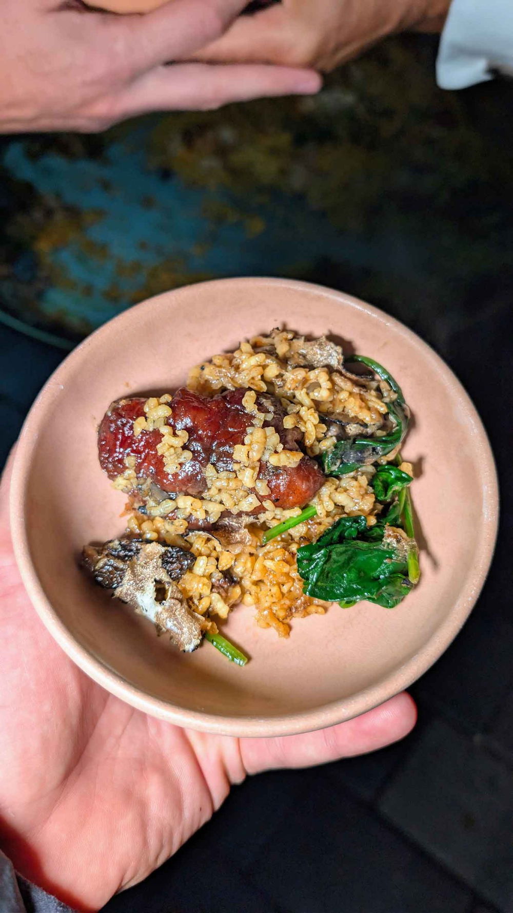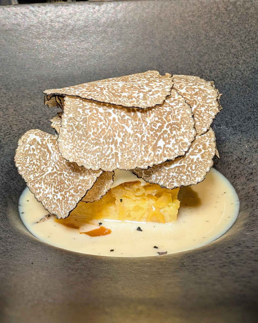 Una di queste è la versione autentica del suo territorio, un riso ricco condito con funghi, due tipi di tartufo e diverse parti del maiale. Un piatto conviviale e opulento che scalda il cuore.