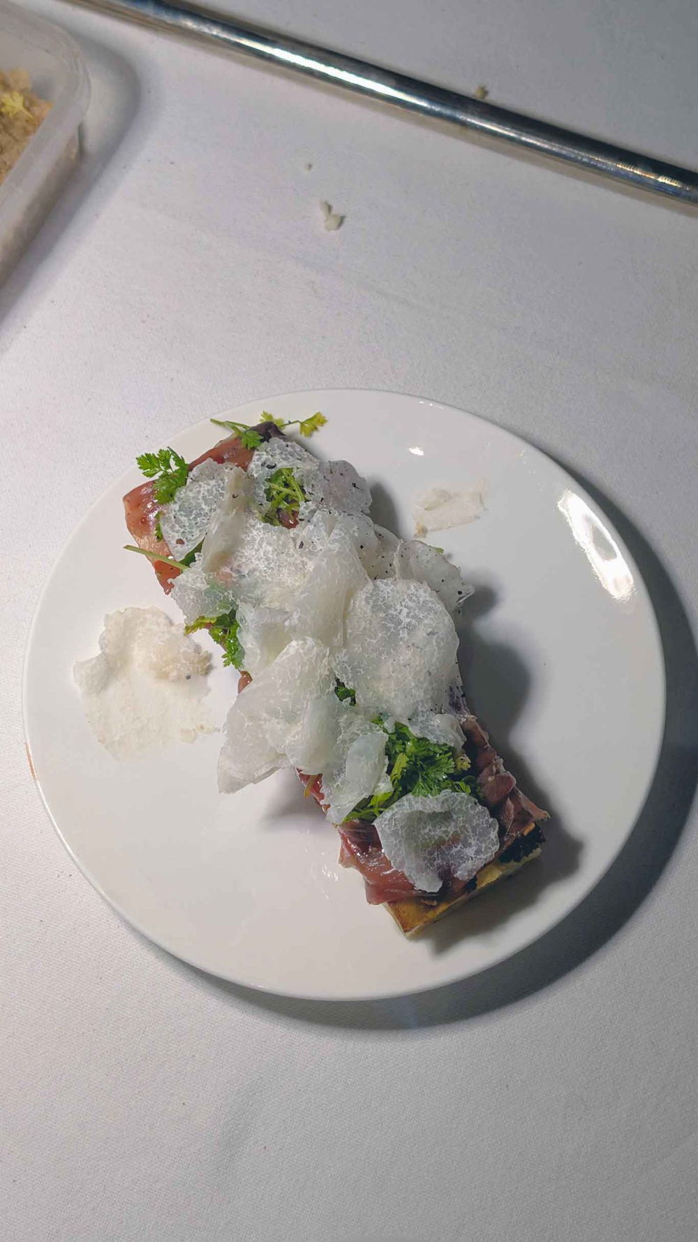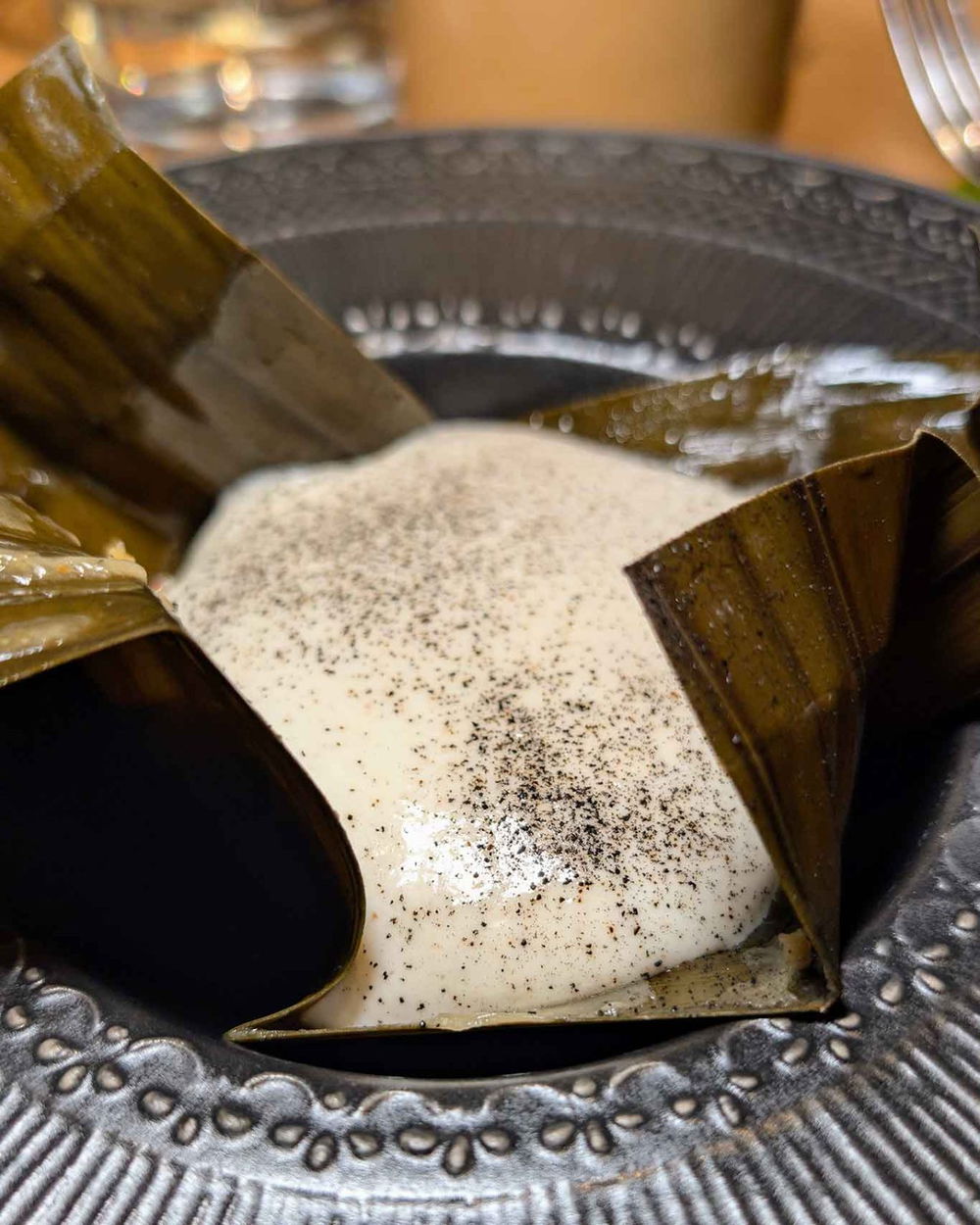Il primo a condurci lontano è Jorge Vallejo. La sua Mussel Tostada with Mole De Mar è un morso che racchiude l’oceano. Su una tostada croccante, una tortilla di mais cotta fino a diventare friabile, adagia un “mole de mar”, una salsa complessa a base di capesante e peperoncino guajillo, sormontata da cozze appena grigliate. È un’esplosione di Messico, sapida e affumicata.