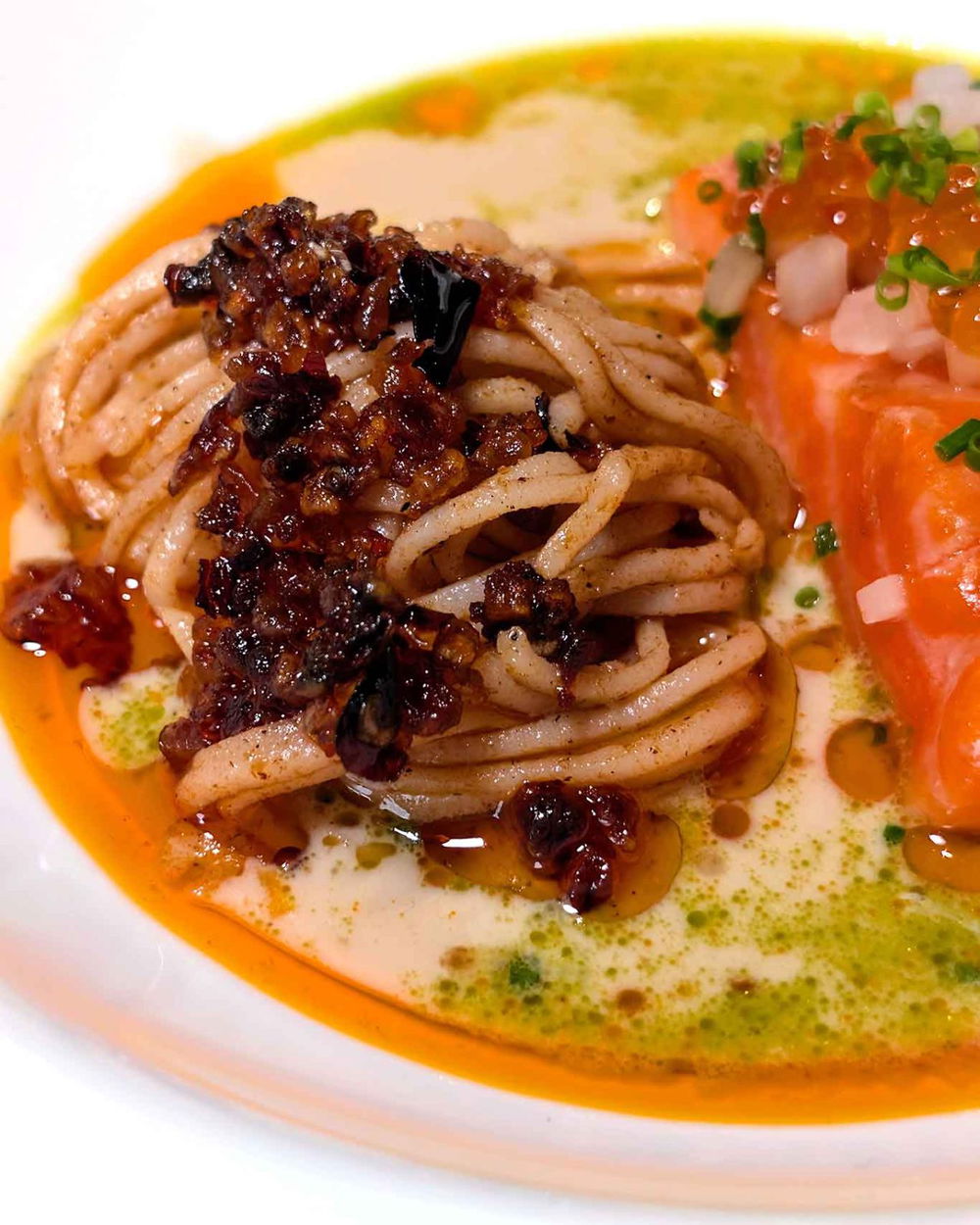Dalle vette dell’Himalaya, Prateek Sadhu porta con sé storie di necessità e resilienza. Il suo Sunderkala ci sorprende. “Se pensate all’India, non vi vengono in mente i noodles”, dice, “ma in una piccola comunità del nord sono nati per necessità”. Eccoli, serviti con trota affumicata, un omaggio al pesce simbolo della sua regione.