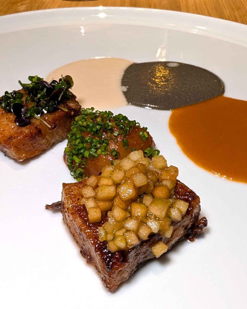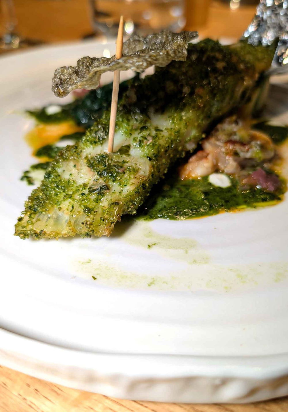 La sua Turbot Cutlet, invece, è un esperimento audace: trattare il pesce con le tecniche della carne. La costoletta di rombo è servita con trippa di rana pescatrice ed erbe selvatiche con una chips costruita con la pelle del pesce fritta e croccante.