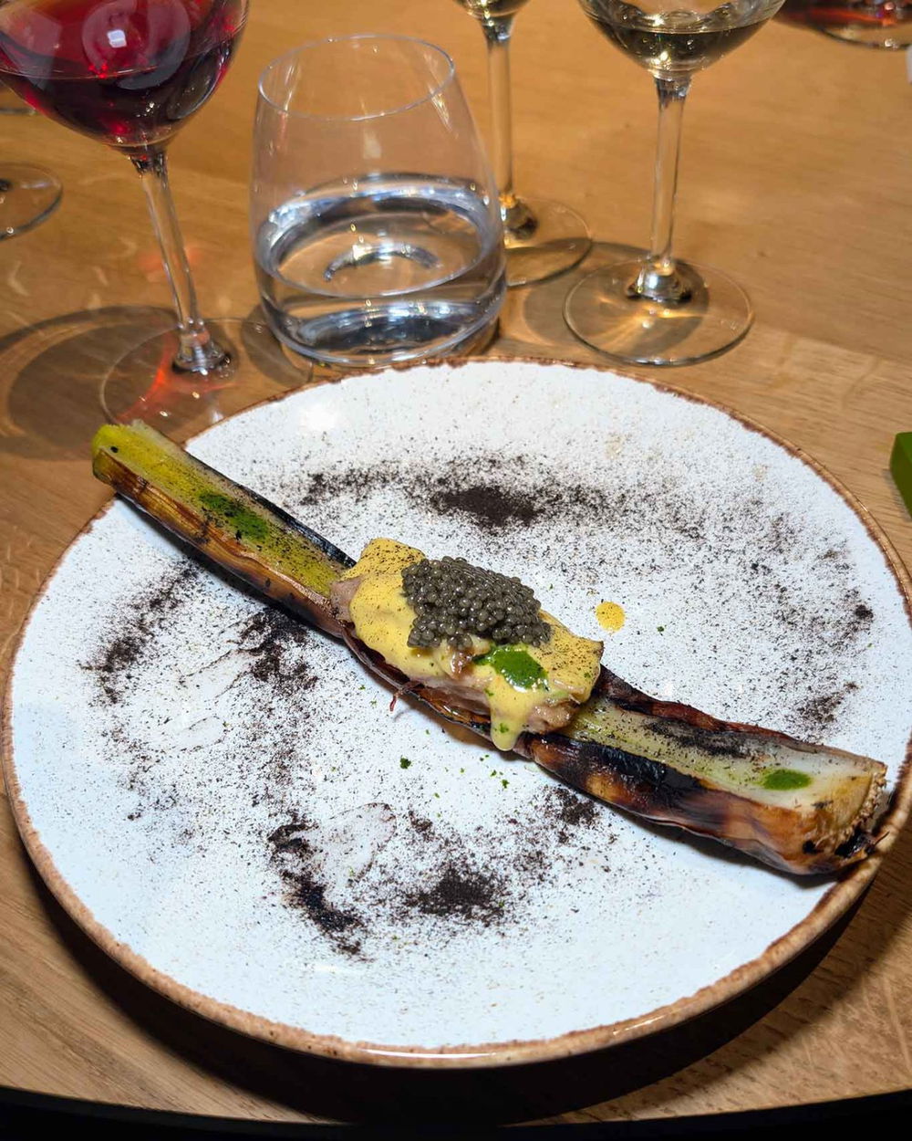 La serata si apre nel cortile, dove l’aria frizzante di ottobre è riscaldata dal forno a legna. L’aperitivo è un rito che unisce due mondi: la pizza e lo champagne. Michele Di Già dell’Osteria Francescana propone una pizza con anatra, spugnole, topinambur cotti sotto le braci e tartufo bianco. Un lusso che sa di terra e di bosco.
