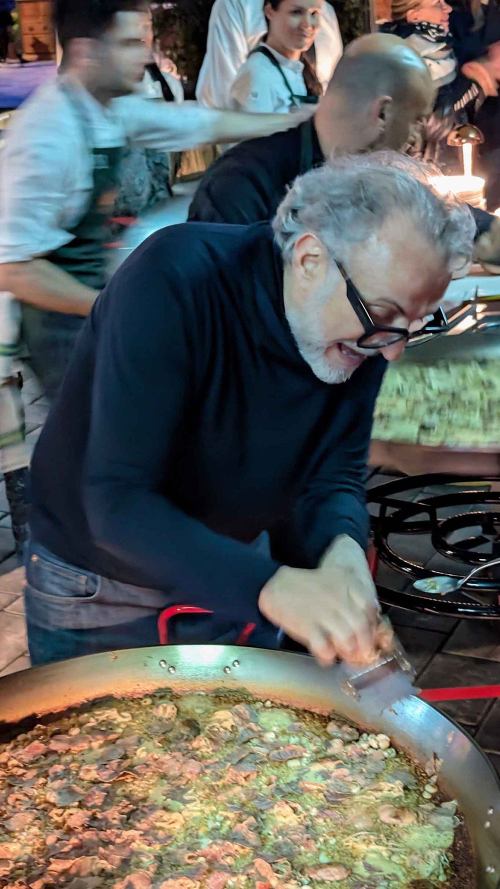 Quique Dacosta aveva promesso una sorpresa sulla brace da Bottura, e la mantiene. Con una sola paellera, realizza due diverse paella.