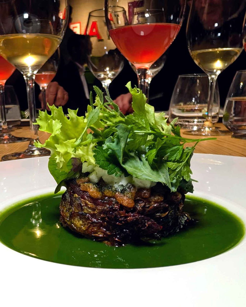 Dalle Alpi Giulie, Antonia Klugmann porta un piatto sulla brace di Bottura che è pura poesia. I suoi Ravioli alle Erbe di Vencò sono “una farfalla, perché vivono un solo giorno”. Il ripieno cambia quotidianamente con le erbe raccolte. Al mattino da un raccoglitore di fiducia, lo stesso che le ha portato il fungo maitake che accompagna il piatto, un “Grifola frondosa, un nome che sembra uscito da Harry Potter,” scherza la chef, “grigliato direttamente sulla brace”.