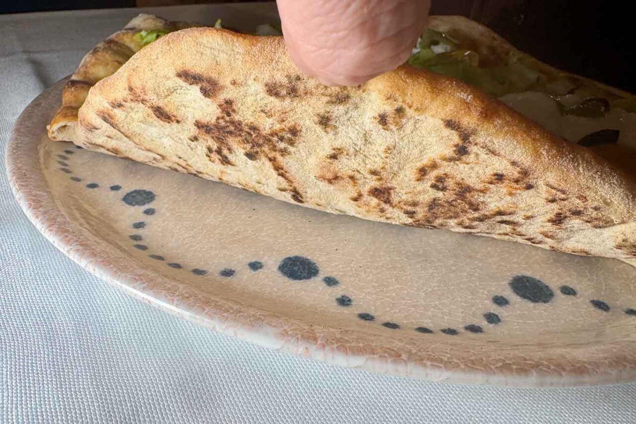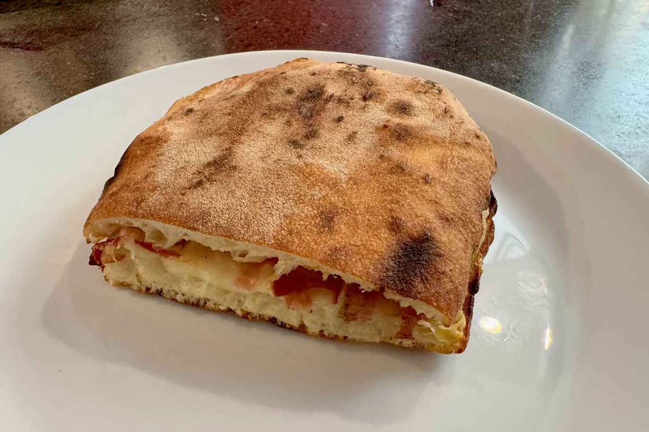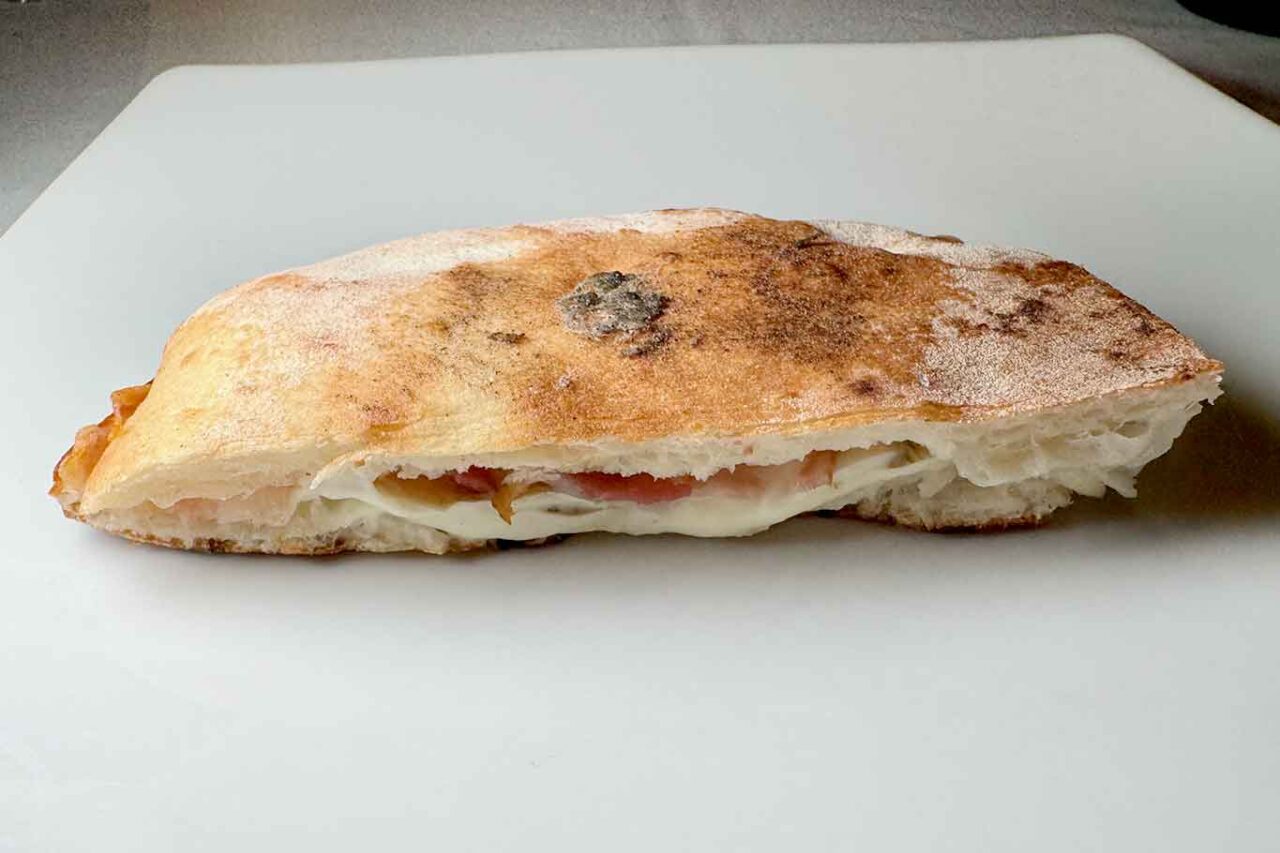 La farcitura è con mozzarella di bufala e pancetta. Un classico insuperabile e qui il panuozzo ha la sua crosta croccante e il cuore morbido (16 euro e si può anche richiedere il mezzo panuozzo).