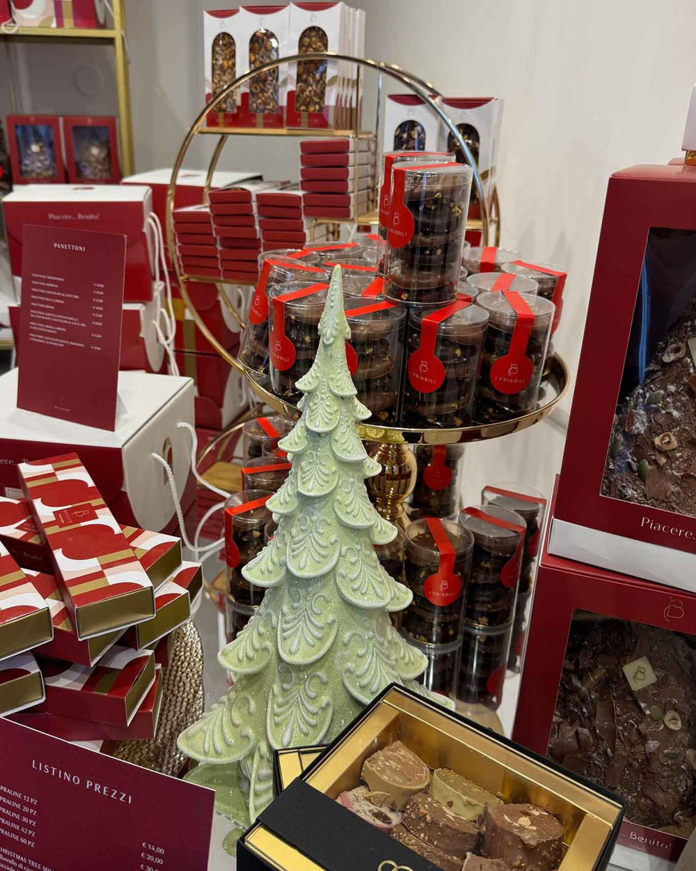 Alberello di cioccolato al latte con nocciole tostate o di cioccolato fondente con frutti rossi, 42 euro.