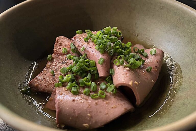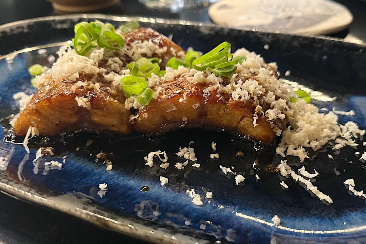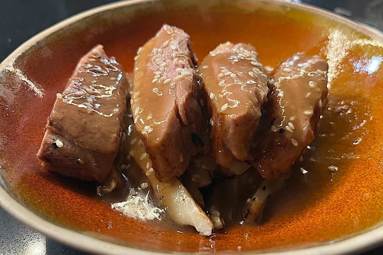 Arriva al bancone il Fegato e ponzu, fegato di vitella piemontese cotto sul Josper a fuoco lento per tutta la notte. Servito freddo, tagliato a fettine sottili e condito con salsa ponzu fatta in casa e pepe di Sichuan. Un piatto semplice, ma dall’incredibile forza espressiva che racconta in modo chiaro l’anima di Brace Pura.