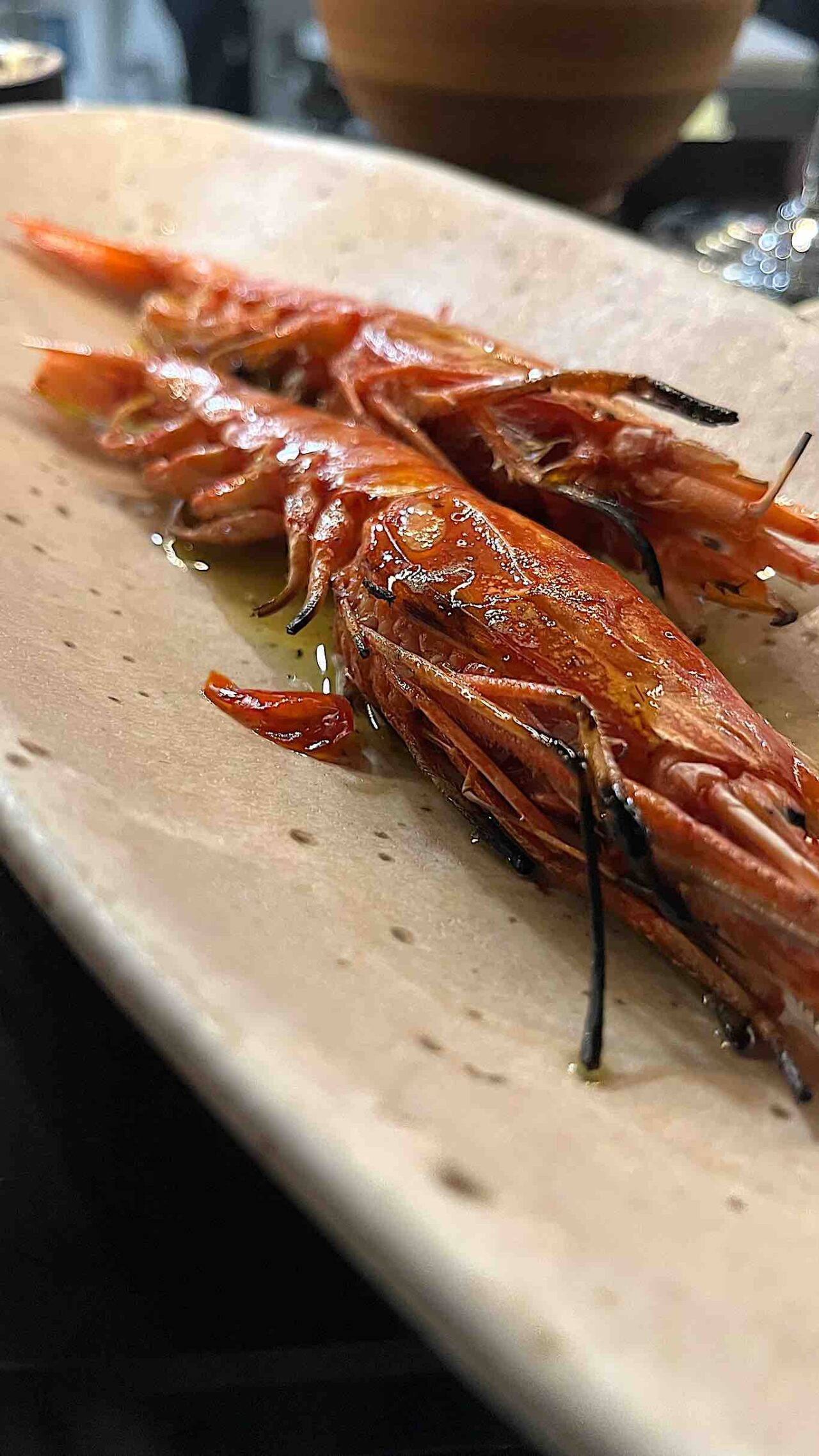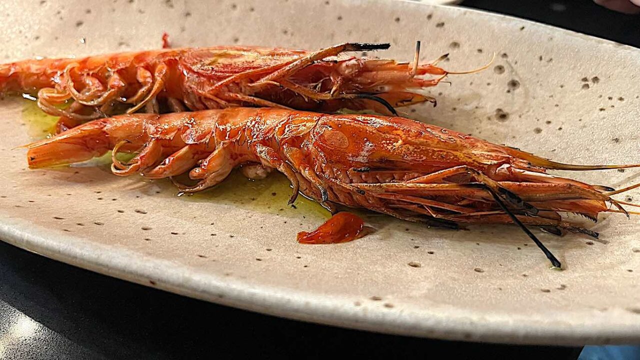 Proseguiamo con Gamberi di Oneglia aglio, olio e peperoncino. Anche in questo caso i gamberi vengo passati pochi secondi sulla griglia e conditi con un olio aromatizzato all’aglio orsino e dei pezzettini di peperoncino habanero fermentato. Quando si dice la semplicità paga sempre.