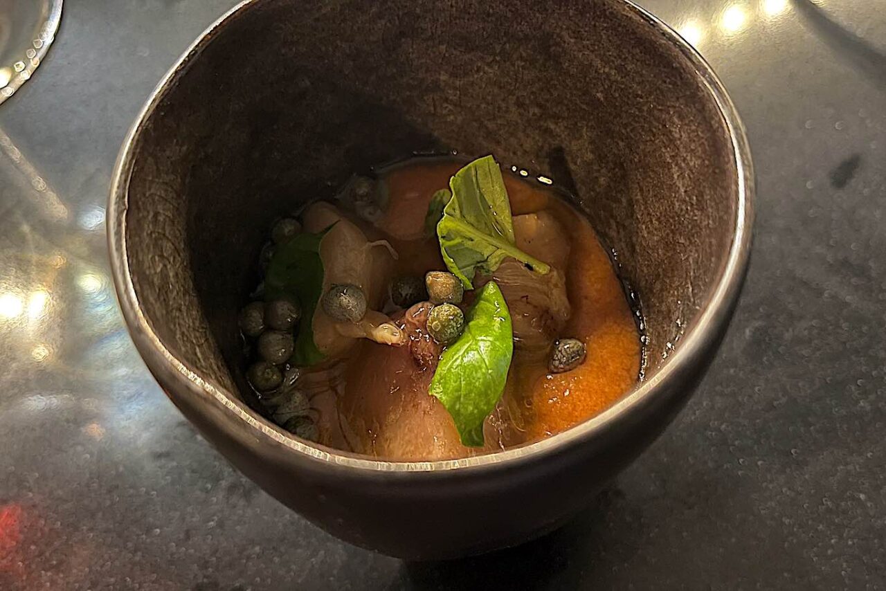 Termine la sequenza vegetale il Gazpacho, pesche tabacchiera alla brace e capperi di Pantelleria.