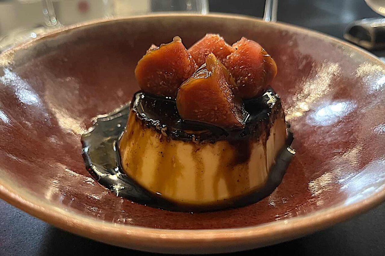 Per concludere in dolcezza Purin all’aceto balsamico. Dolce, cremoso e ben completato con una glassa di aceto balsamico che gli conferisce note sia dolci sia aciduli e fichi sciroppati.