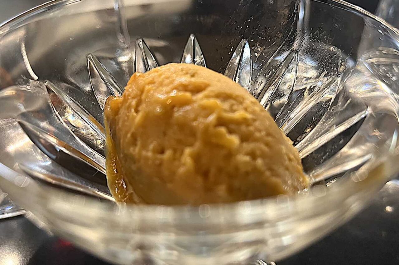 E Sorbetto di albicocca alla brace. Le albicocche vengono cotte da Brace Pura e poi lavorate per diventare sorbetto dal team di Aria Gelateria.