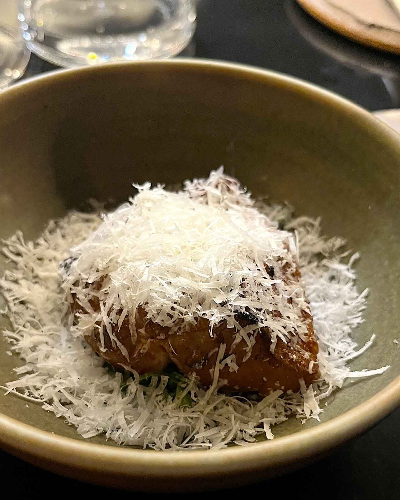 Le animelle sono un’altro di quei piatti di cui avremmo fatto volentieri il bis. Alla base delle animelle una crema di pepe verde fatta proprio come negli anni ’80 quindi con scalogno, panna, pepe verde in salamoia schiacciato e frullato. Unica variante vermouth bianco chinato invece del brandy. A completare il piatto una abbondante grattugiata di cacio.