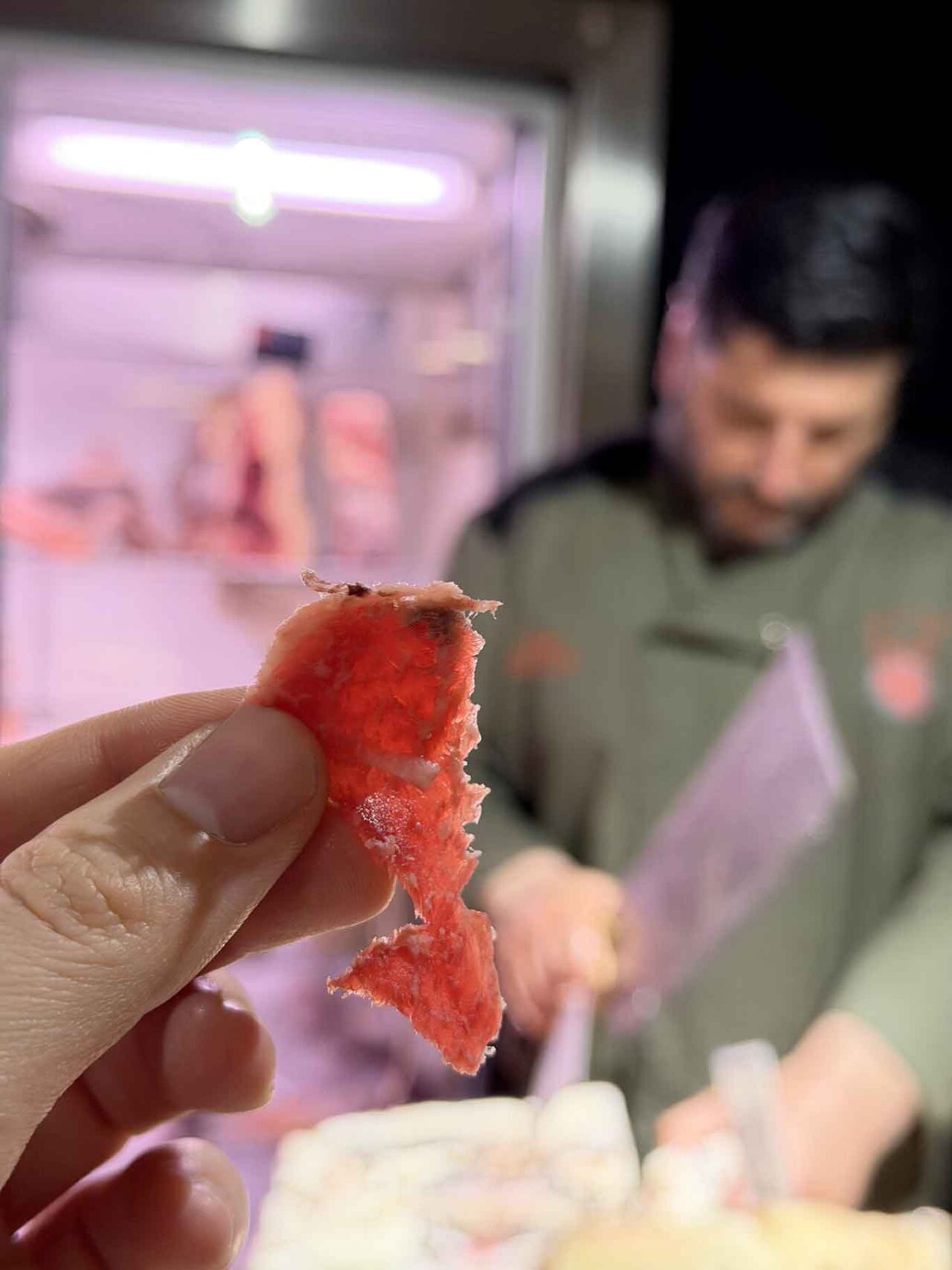 E poi quei momenti sospesi: dopo il taglio, afferri quel frammento di fibre, grasso e collagene — materia viva, tremante — e lo porti alla bocca. Il gesto si fa sacramento. Frollature da tempo incarnato. Un viaggio.