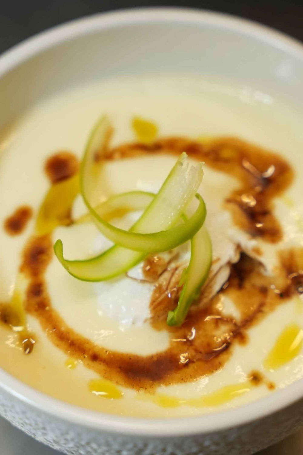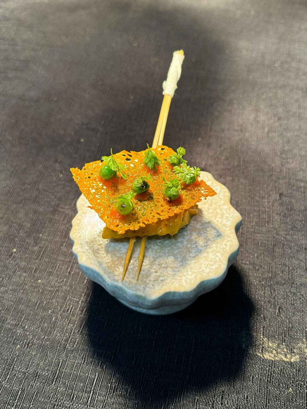 Noi siamo partiti con lo Shisogreen, cioè il vegetale che non accompagna il piatto ma è portata che vive di vita propria. Una foglia di shiso verde in tempura ospita la giada fermentata accompagnata da lime e pepe orientale. La brunoise di mela verde regala freschezza, mentre le perle di yuzu danno la spinta acida.