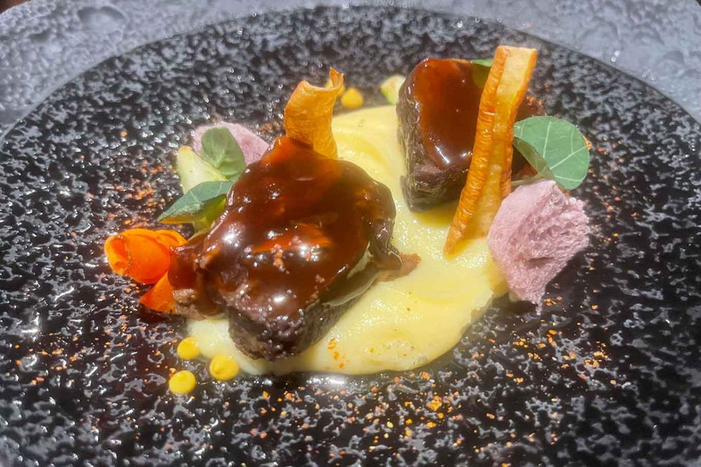 Ribs di bovino brasate all’aglianico, purea di patate, scomposto di verdure e jus di manzo (24 euro). Gustose e ben cucinate. Abbinamento squisito con purea di parate di scuola francese.