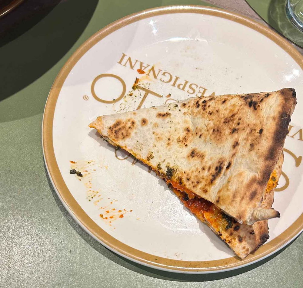 Gli ingredienti sono praticamente tutti messi dopo cottura, quindi al morso si percepisce una bella freschezza. Il fritto è svolto benissimo per cui non si avverte la necessità di sgrassare. Desiderabile invece una maggiore croccantezza seppur la fetta regga bene sia il peso del topping sia il morso che non è ostacolato dallo spessore.