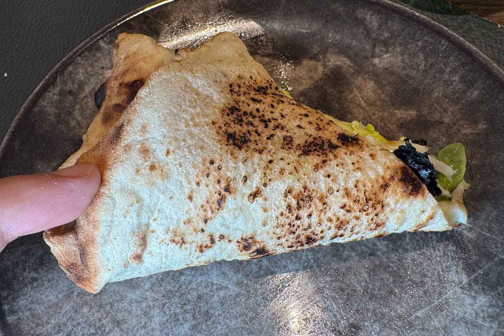 Arrivano nudi in superficie e con una farcitura che grida il concept del Less is more. Tre soli ingredienti ma generosi: ricotta, provola e salame. Pochi fronzoli ma con un carattere limpido e deciso. Identitario. Scottano ma si fanno mangiare. Personalità a metà strada tra tendenza dolce e sapidità. La salvietta di bufala abbraccia con costanza forse un po’ troppo avvolgente, il latticino affumicato aggiunge una nota calda e profondamente aromatica, con la sua leggera scia di fumo, e il salume titilla con il suo accento.