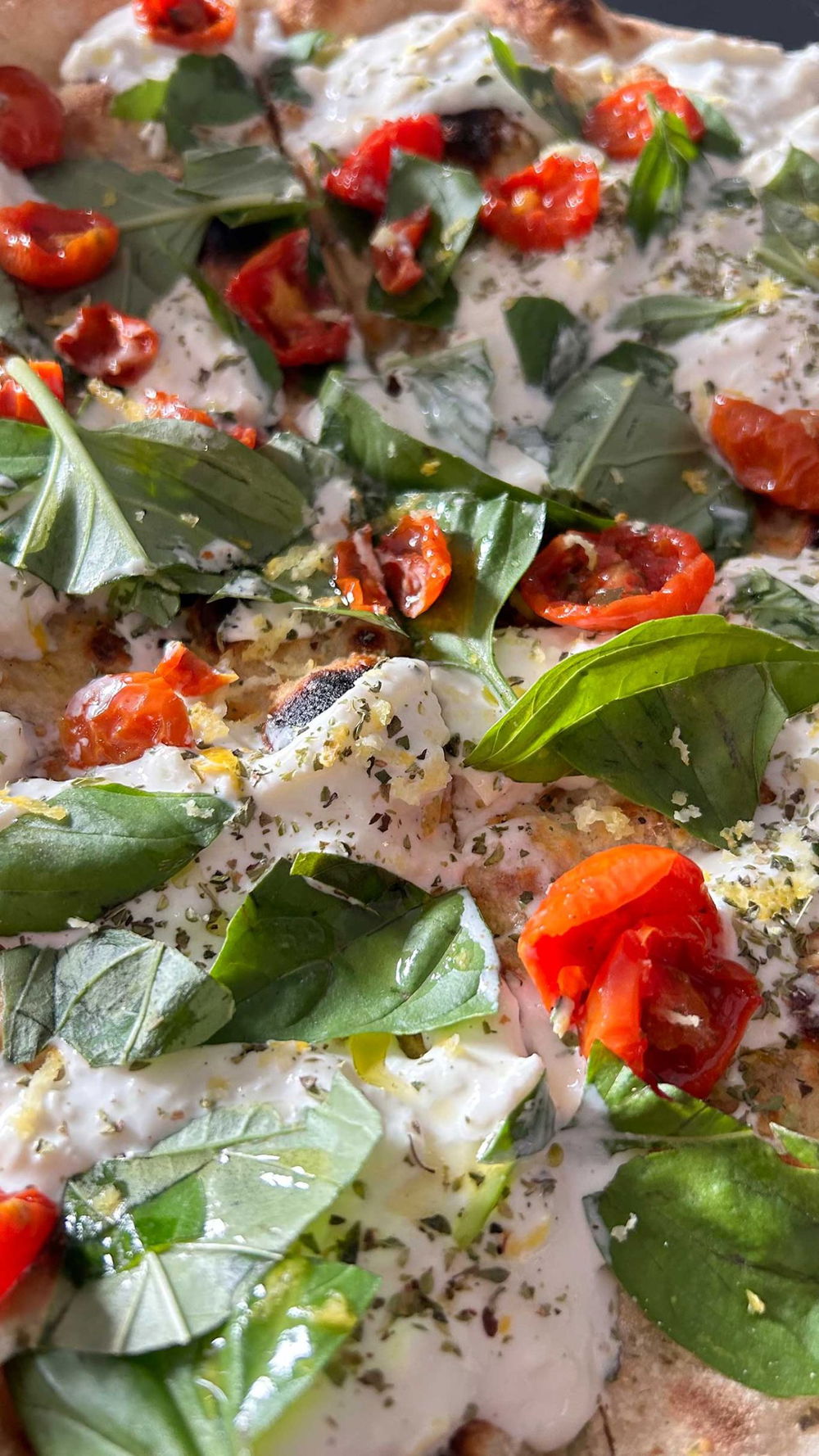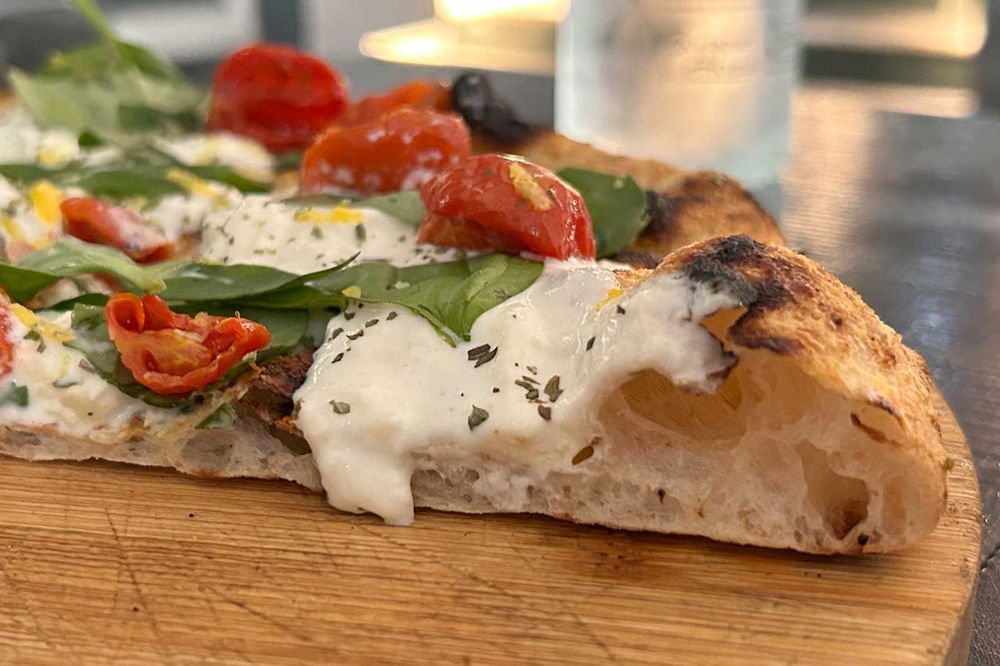 Focaccia origano e parmigiano reggiano, stracciata di bufala, zeste di limone, pomodorino ciliegino semy-dry e basilico (12 euro).