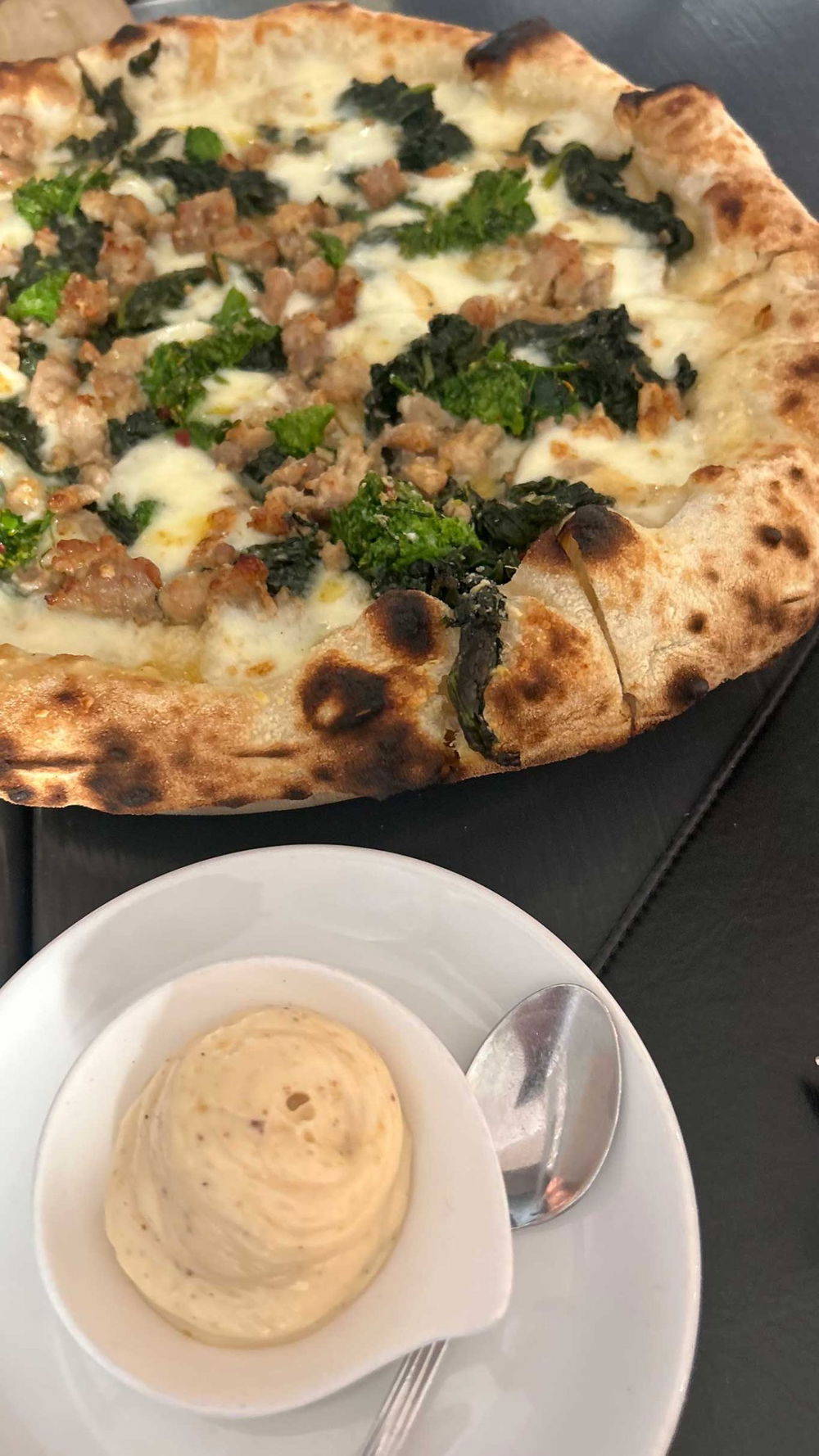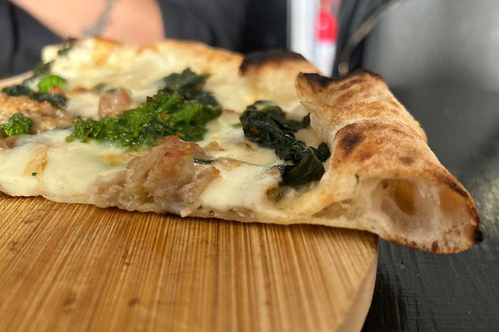 Salsiccia, friarielli, provola, pecorino, olio all’estratto di friarielli (12 euro).