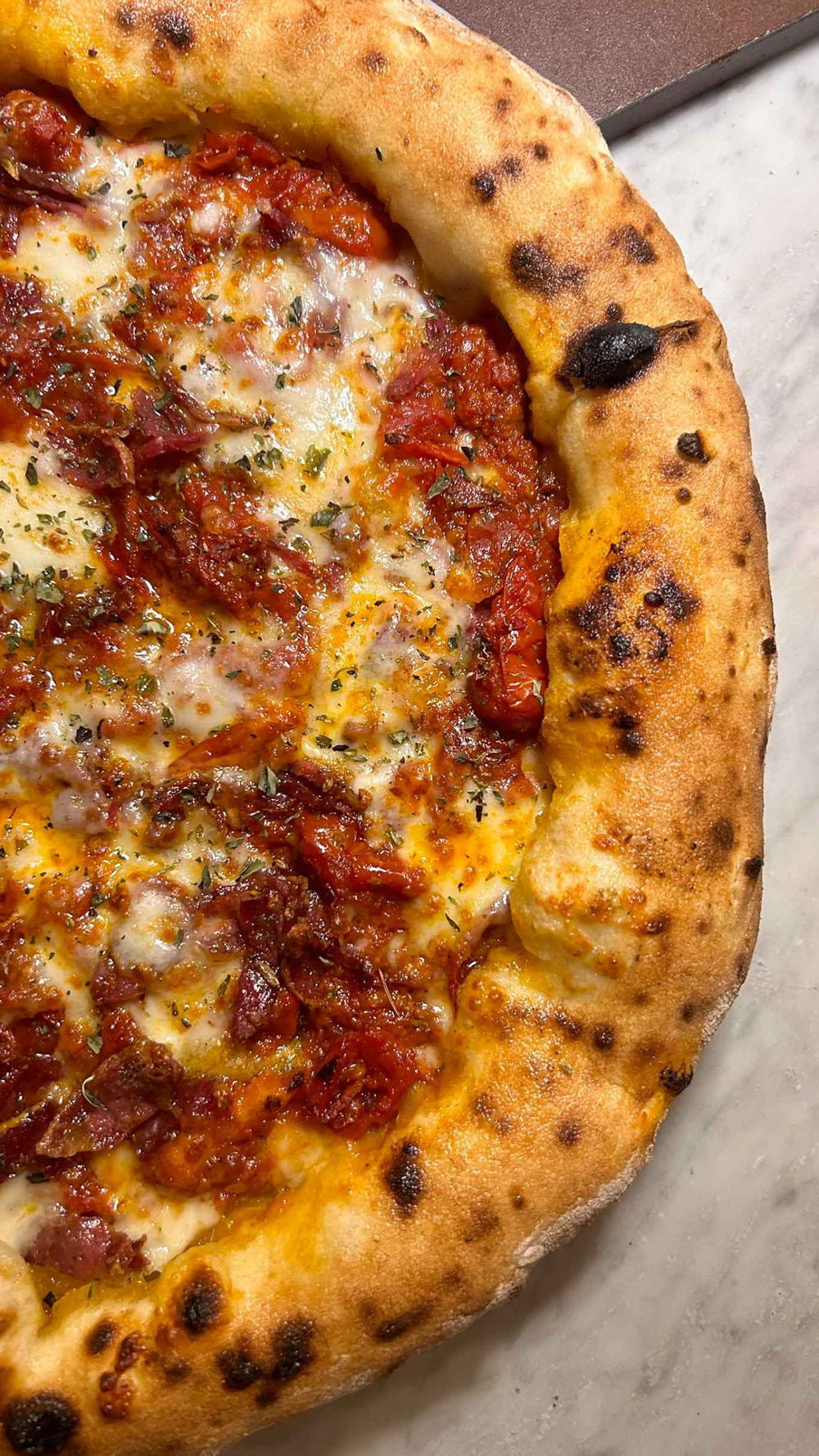 Fiordilatte, pomodoro San Marzano, salame piccante, origano e olio EVO (12 euro). Aggiunta di Piennolo del Vesuvio (cono Rocco) e sostituzione del salame con la salsiccia stagionata di suino nero casertano.