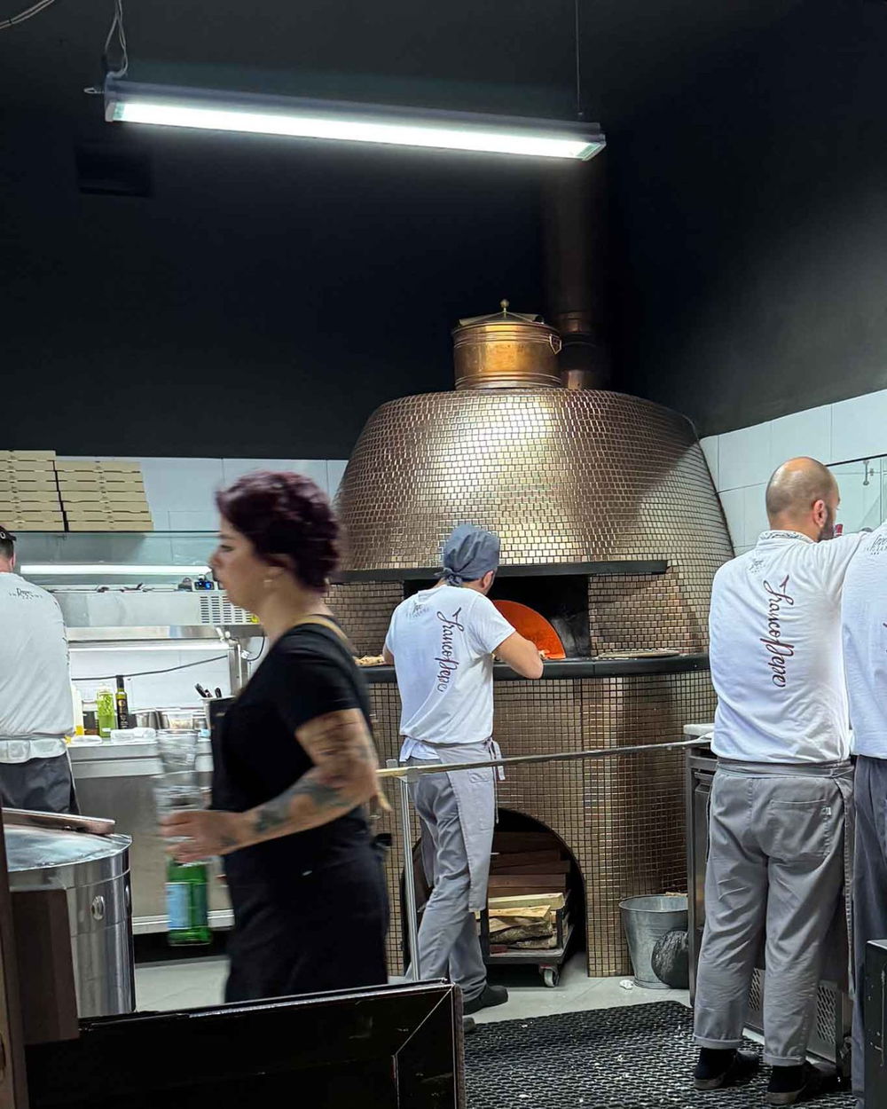 Il profumo è schietto e rimarca l’attenzione alla composizione del topping che coinvolge occhi e naso. Sul versante cottura, in evidenza il nuovo forno a legna Leaf Oven di Fazzone ma a basso impatto ambientale con la camera di combustione ribassata rispetto al piano.