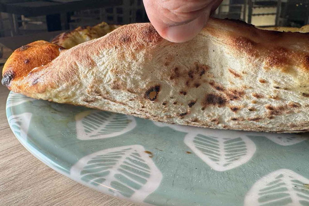 Una configurazione che minimizza al massimo gli incombusti, abbassa il consumo di legna e regala una cottura dolce in superficie. Quello che ci vuole per esaltare gli ingredienti di farcitura. La scelta di Bruner è per un impasto che si avvicina a quello del pane, leggermente consistente ma ben masticabile. Il cornicione resta però resta arioso a differenza del disco che propone uno spessore importante. Un’ottima pizza.