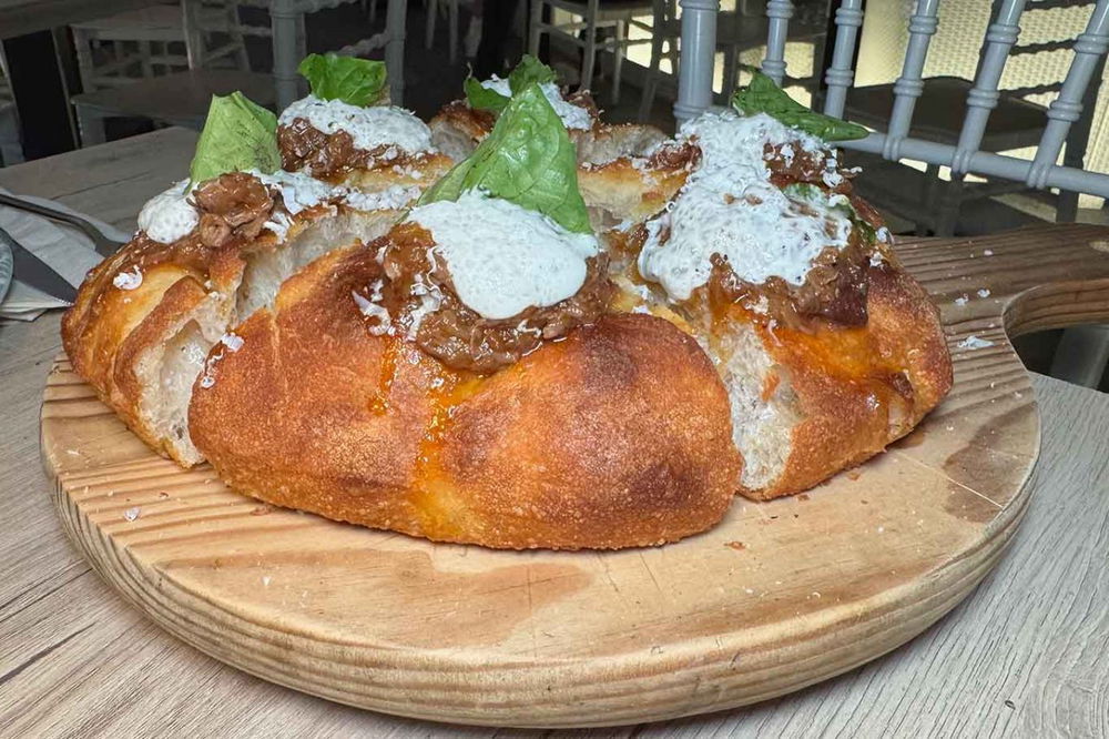 Padellino in doppia cottura non fritta con sugo alla genovese classica napoletana, spuma di provola, cacio ricotta del Cilento, pepe nero macinato fresco (13 euro).