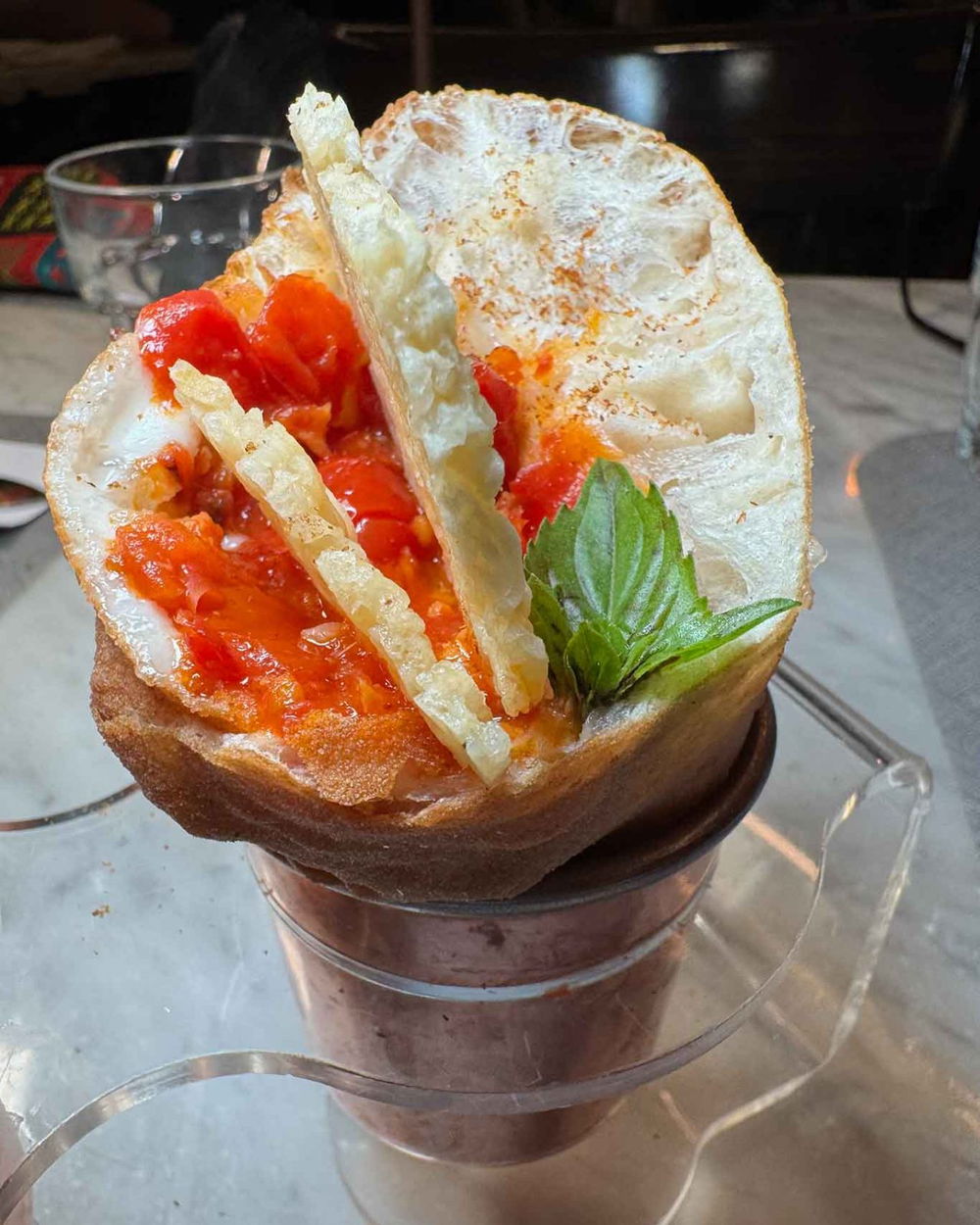 Cono di pizza fritta con fonduta di Grana Padano DOP 12 mesi, formaggio pecorino, Piennolo del Vesuvio DOP, aromi, salsiccia di suino di razza casertana, peperoncino, chips di pecorino, basilico (12 euro 2 pezzi).