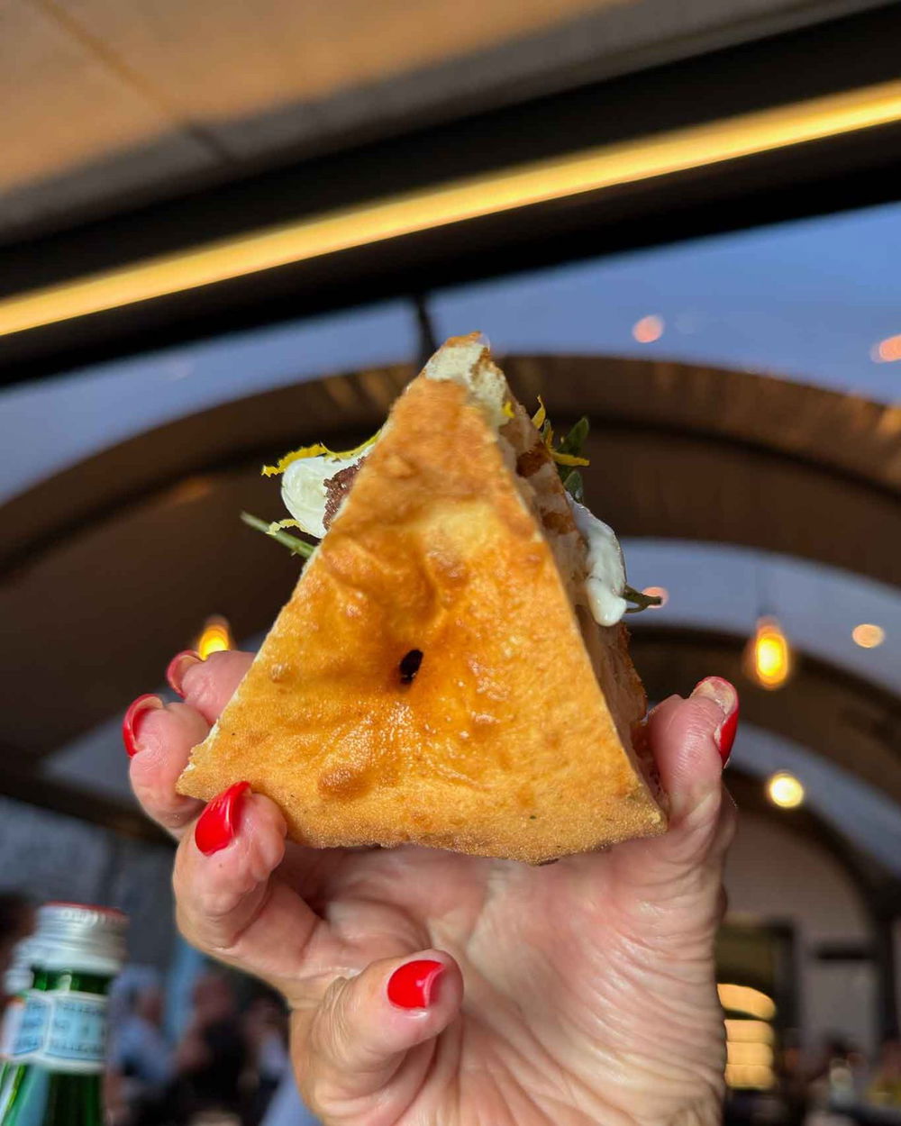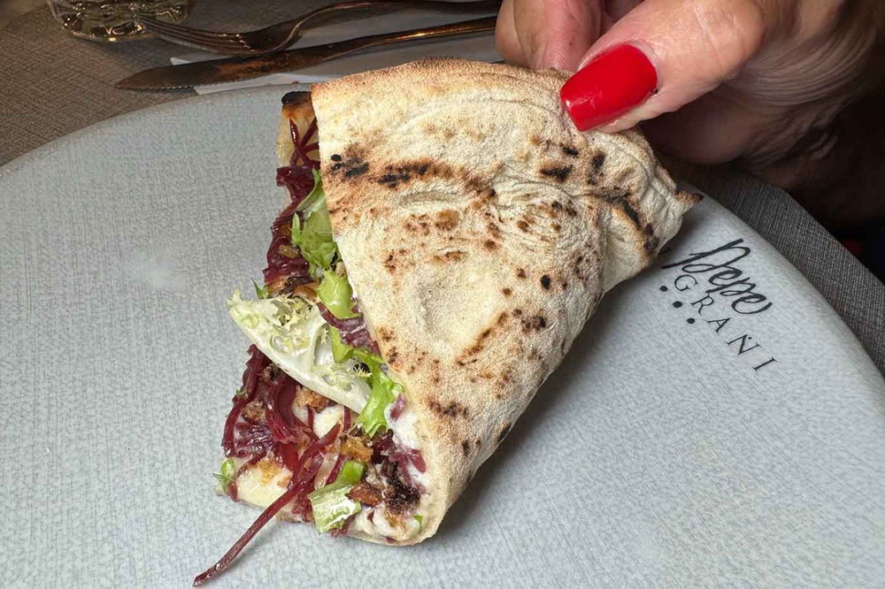 Trancio di pizza fritta. Patè di olive caiazzane, stracciata di bufala, misticanza, zaatar, zeste di limone (10 euro).