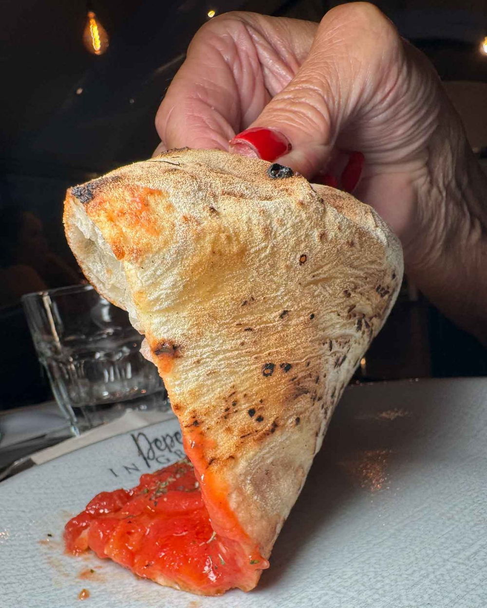 E qui entriamo in piena classicità e area comfort food. La pizza Marinara di Pepe in Grani è un prototipo da studiare per chi vuole farsi una cultura alla voce pizza napoletana. Ricca di pomodoro, sugosa e a tratti laida di abbondanza, umida ma non bollita. Grande qualità dei prodotti, grande capacità di dosare osando con ricchezza.