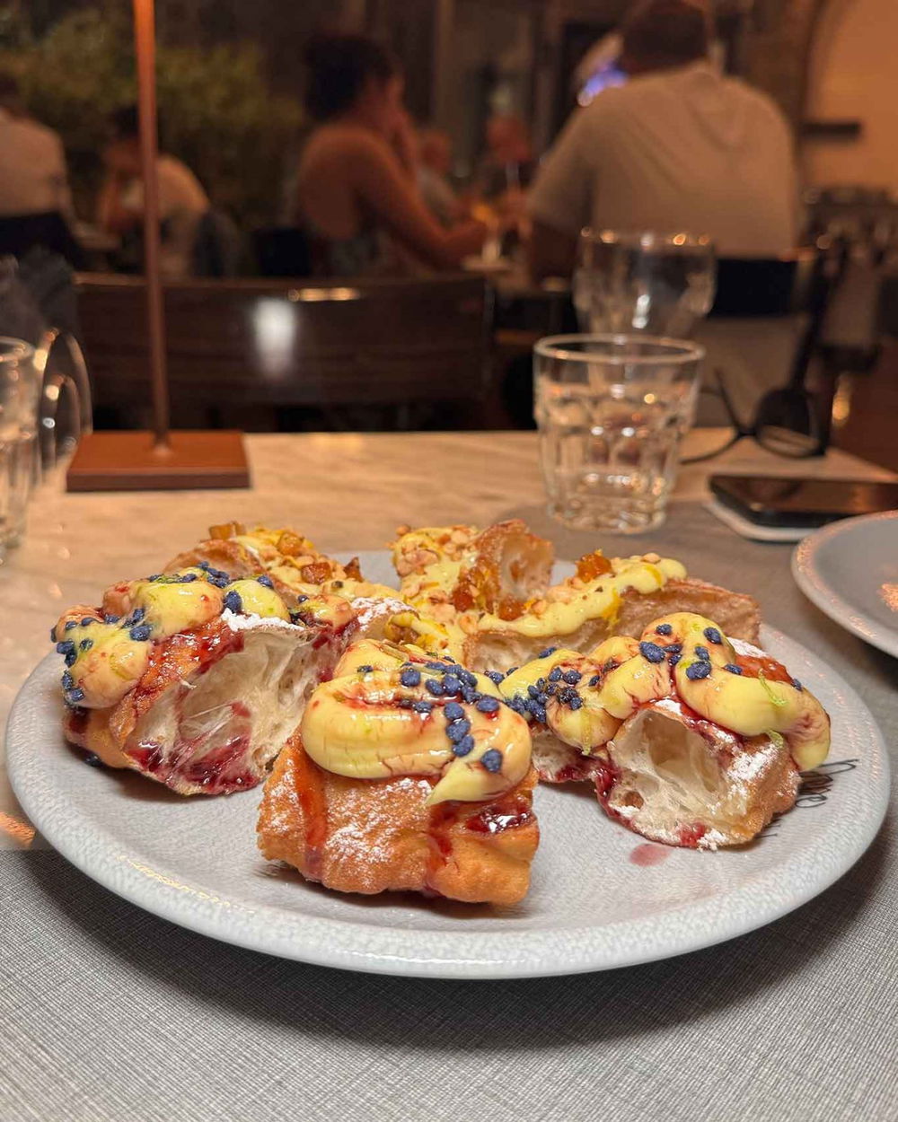 Trancio di pizza fritta con crema pasticciera, sciroppo di gelso, burro, cristalli di violetta, zest di agrumi e zucchero a velo (6 euro).