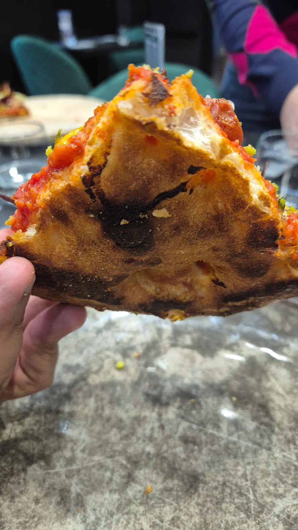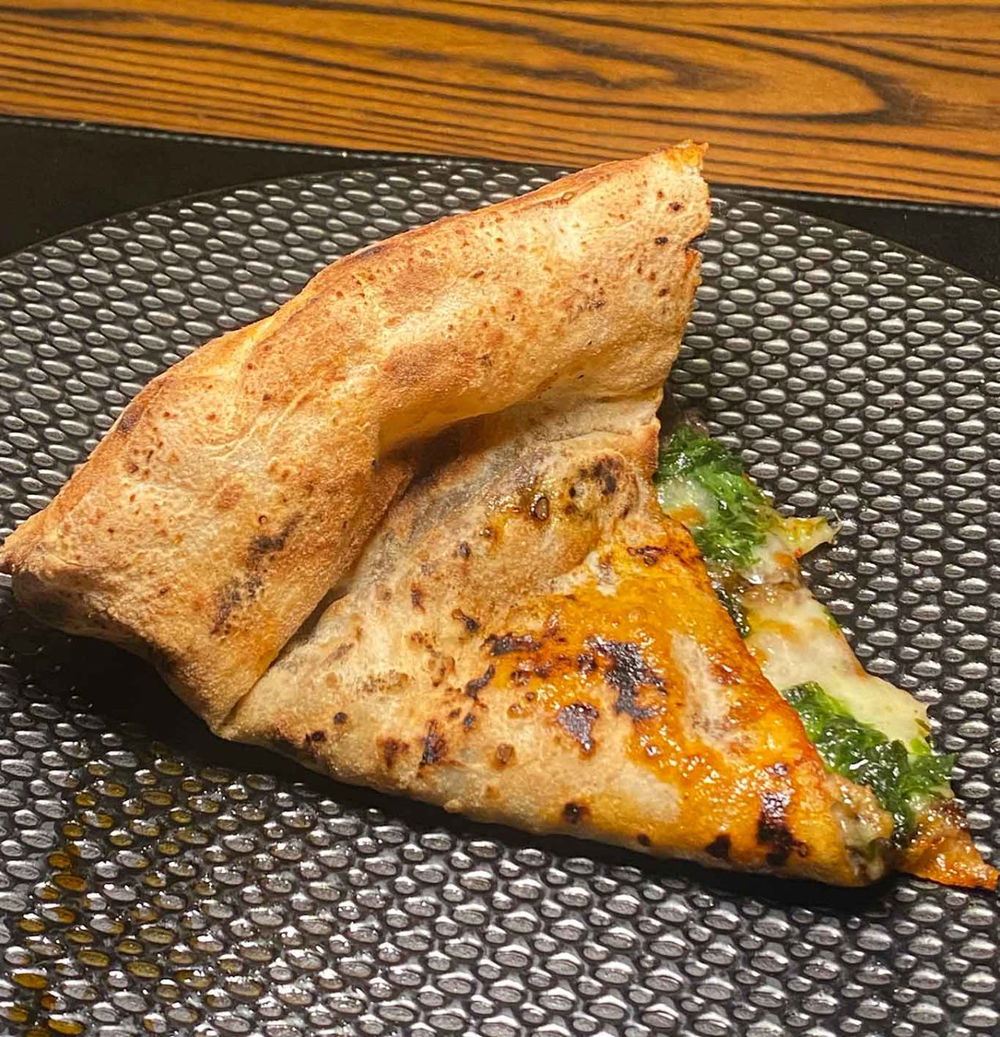 Abbandonate l’identità del classicismo partenopeo. La Salsiccia e Broccoli secondo Bove è una rivisitazione burlesque dell’intramontabile sposalizio. L’impasto è ancora una volta profumato e leggero, con una cottura che potrebbe fare scuola. La costruzione è una sequenza stratificata: delicatezza di fiordilatte, poi una spennellata corposa di crema di friarielli, verde intensa, dal respiro vegetale. Morbida, vellutata, avvolge con eleganza, senza sgarri, una linea aromatica poco amara e molto educata. La salsiccia pezzentella è rustica, saporita, quasi bucolica nei suoi aromi affumicati e speziati. Si scioglie in piccoli scrigni di gusto che punteggiano ogni fetta con decisione, come colpi di scena ben piazzati.