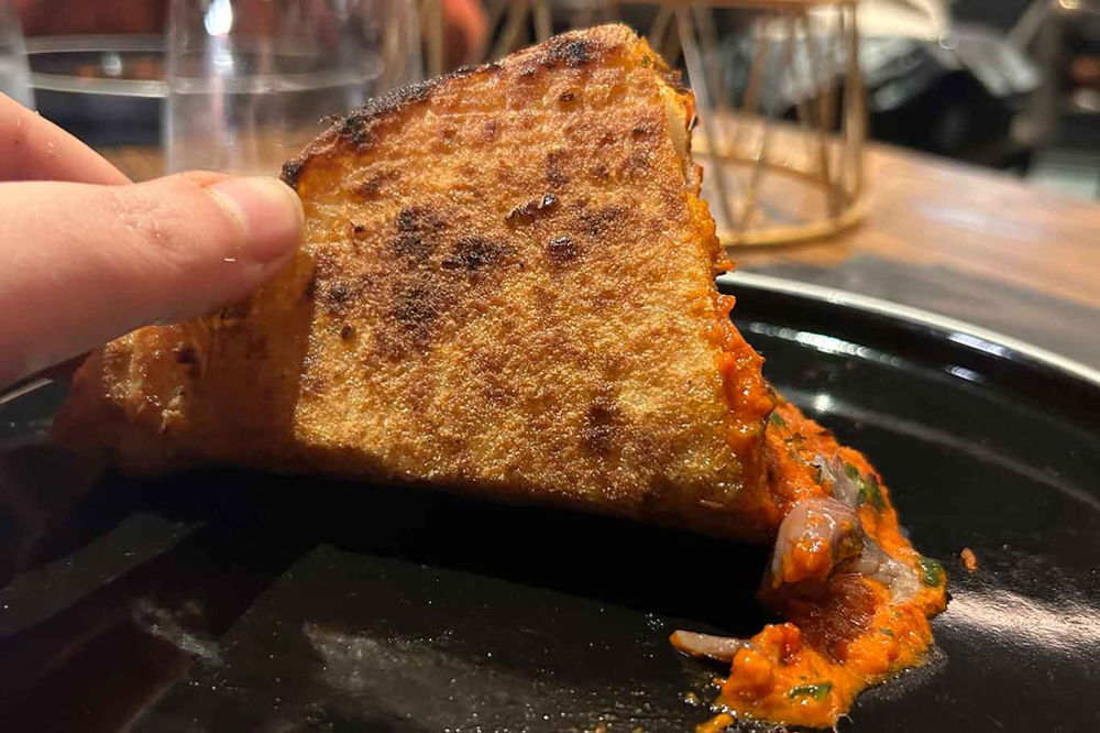 Fiordilatte, patè di olive caiazzane, ‘nduja di spilinga, pesto di aglio orsino (13 euro)