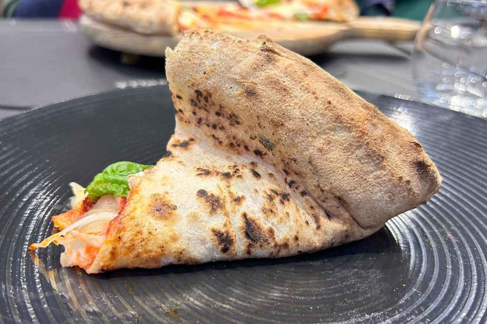 Una fusione che non ha bisogno di proclami: una pizza che si fa piatto e un piatto che si fa pizza. Concetti che coesistono, delicatezza e vigore, dolcezze e punte aromatiche, in un equilibrio di pura identità martucciana. Magistrale.