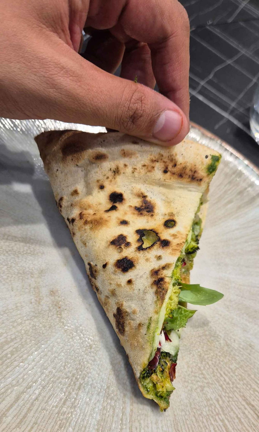 Fiordilatte, crema di friarielli, salsiccia pezzentella, smashed di broccoli baresi, salsa al blu di bufala, croccante rosso lucano, basilico, olio evo monocultivar Ortolana Frantoio Romano (13 €)