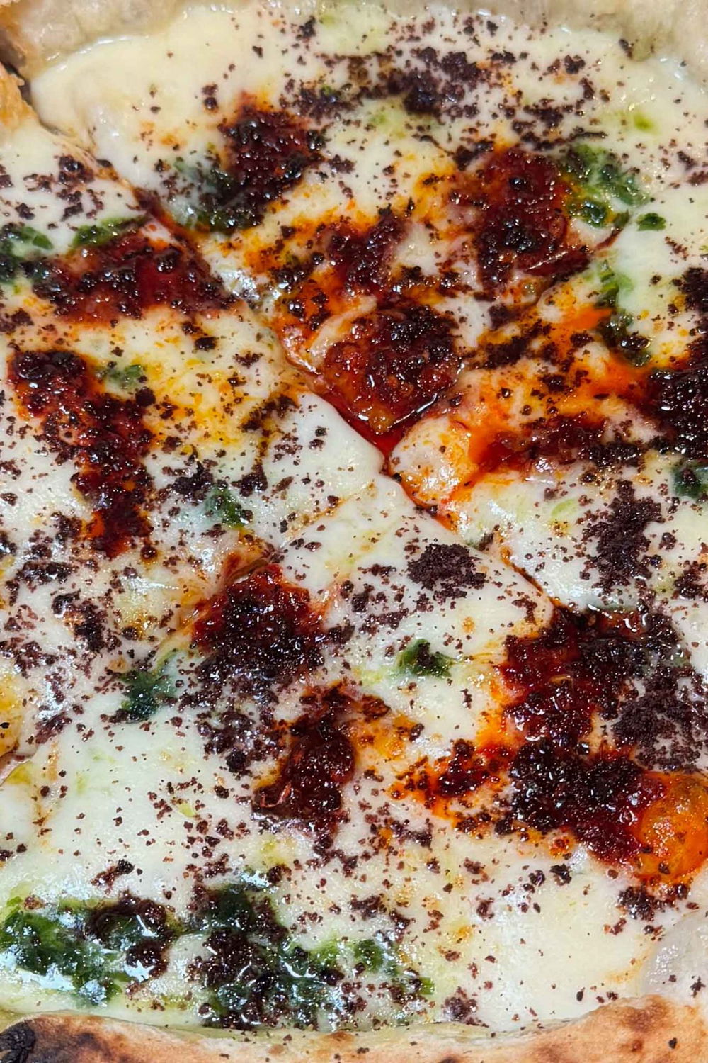 San Marzano DOP, salame Napoli di maialino nero Casertano, peperoncino fresco, fior di latte dei Monti Lattari, basilico fresco, olio EVO (10 euro).