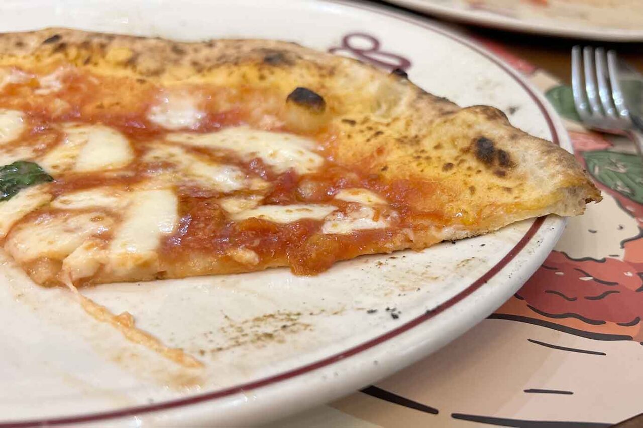 La marinara offre la miglior soddisfazione gustativa tra le tre pizze richieste. Qui tutto ruota attorno alla qualità del pomodoro e dell’olio: entrambi appaiono funzionali ma non incisivi. Grazie ad un corretto uso di aglio ed origano, il pomodoro riesce a dare di più in aromaticità ed espressività. Infatti, questa pizza sprigiona un profumo notevole. L’aglio non è invadente, l’origano è ben equilibrato, l’olio è quel giusto extra che regala alla marinara la caratteristica untuosità. Il risultato è una pizza che pur soffrendo le imprecisioni della cottura, restituisce un gusto centrato. È questa la pizza che racconta un’identità chiara e riconoscibile. Rinforza tale concetto anche il prezzo di soli cinque euro per una pizza che sottolinea la sua democraticità.