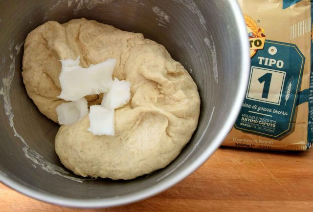 14) Aggiungo qualche tocco di strutto (basta qualche fiocco) sulla superficie e lascio lievitare altre 3 ore sempre a temperatura ambiente.