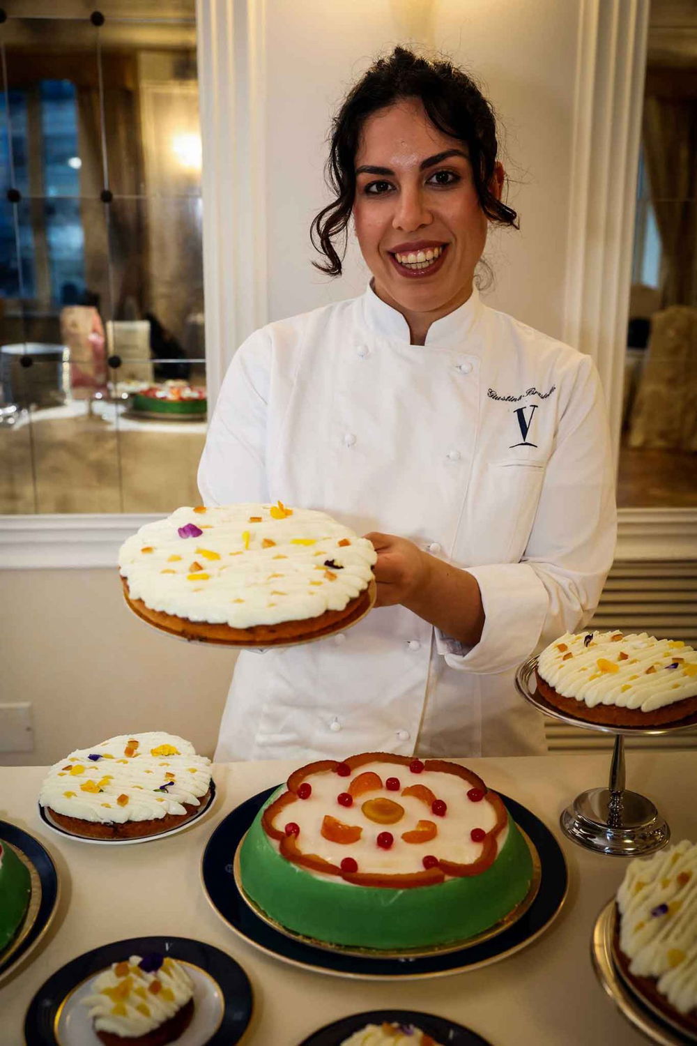 Chiude, ma solo per dovere di ospitalità, la padrona di casa Giustina Brasiello, Pastry chef del Grand Hotel Vesuvio. Per lei il Natale della cassata è con crema frangipane, croccante al cioccolato fondente e pistacchio, amarene e gelée d’arancia in mousse di ricotta, che ha ribattezzato Armonia mediterranea.