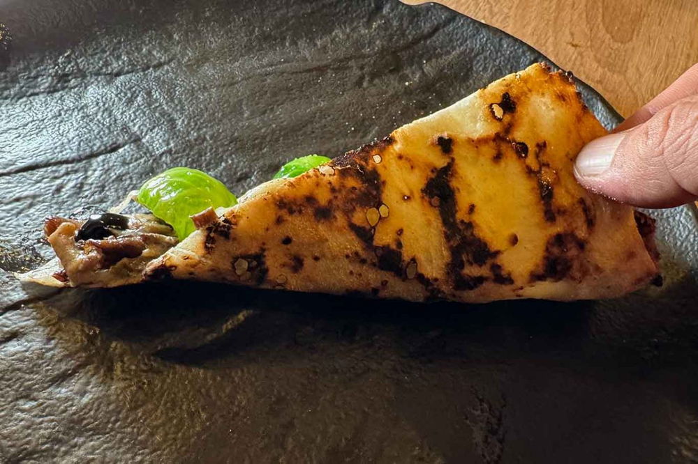 Il crunch estremo, quasi da biscotto, si ritrova nel padellino L’Italiana (15 euro), compendio della filosofia di Concetto Partenopeo. Il carpaccio di vitella marinato nelle spezie è abbinato a misticanza, stracciata pugliese, pomodorino confit e citronette. Un “panino” in cui viene abbandonata ogni remora di morbidezza a favore di un impasto tenuto basso e super croccante.