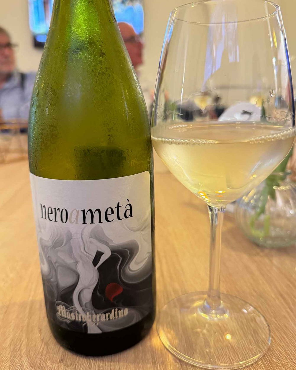 Dalla cantina, Nero a Metà, aglianico vinificato in bianco di Mastroberardino.