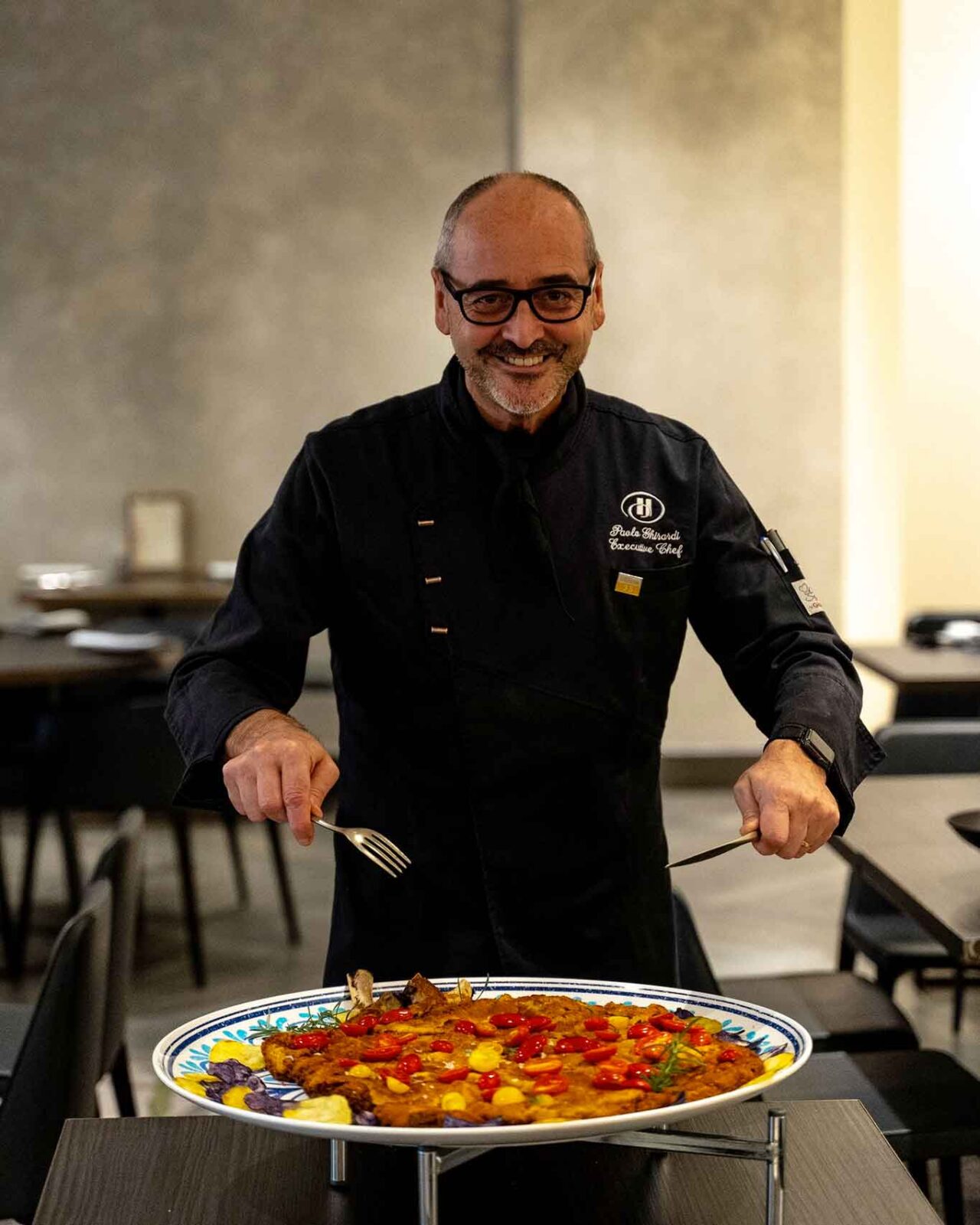 Lo vedete soddisfatto davanti a una (vera) cotoletta Finissima alla Milanese, una delle preferite dai clienti. La prepara con pregiata carne di vitello di razza e la serve con pomodori appassiti e rondelle di patate. Ma a gennaio è il momento di fare i bravi a tavola: niente carne e niente alcolici. Una sorta di espiazione per gli eccessi delle Feste appena terminate. Giusto per prepararsi al Carnevale con chiacchiere, castagnole, pignolate, migliacci, lasagne e tanto maiale.
