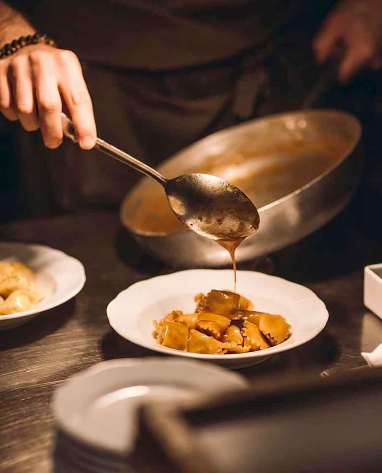 Tra i grandi classici non può mancare il vitello tonnato, piatto apparentemente semplice ma che richiede equilibrio perfetto tra carne e salsa. Poi arrivano i primi: agnolotti e ravioli del plin, che non sono la stessa cosa. I primi hanno forma più regolare, spesso quadrata, mentre i plin sono piccoli saccottini a mezza luna, chiusi con il tipico pizzico delle dita da cui prendono il nome. Come pasta lunga si trovano i Tajarin: tagliolini all’uovo, spesso conditi con burro e tartufo bianco d’Alba o ragù di carne.