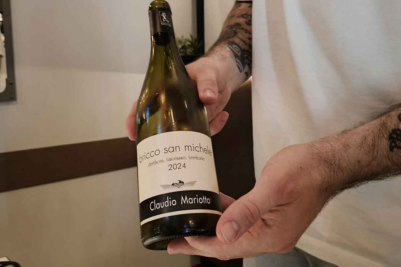 Prendiamo anche un calice di Bricco San Michele, Timorasso di Claudio Mariotto (8 euro) dei Colli Tortonesi. Il Timorasso è un’uva a bacca bianca più carica di glicerina — solitamente 13-14 gradi — che in questo caso restituisce in bocca la sapidità del territorio. È un vino più da pasto rispetto al Lagrein.