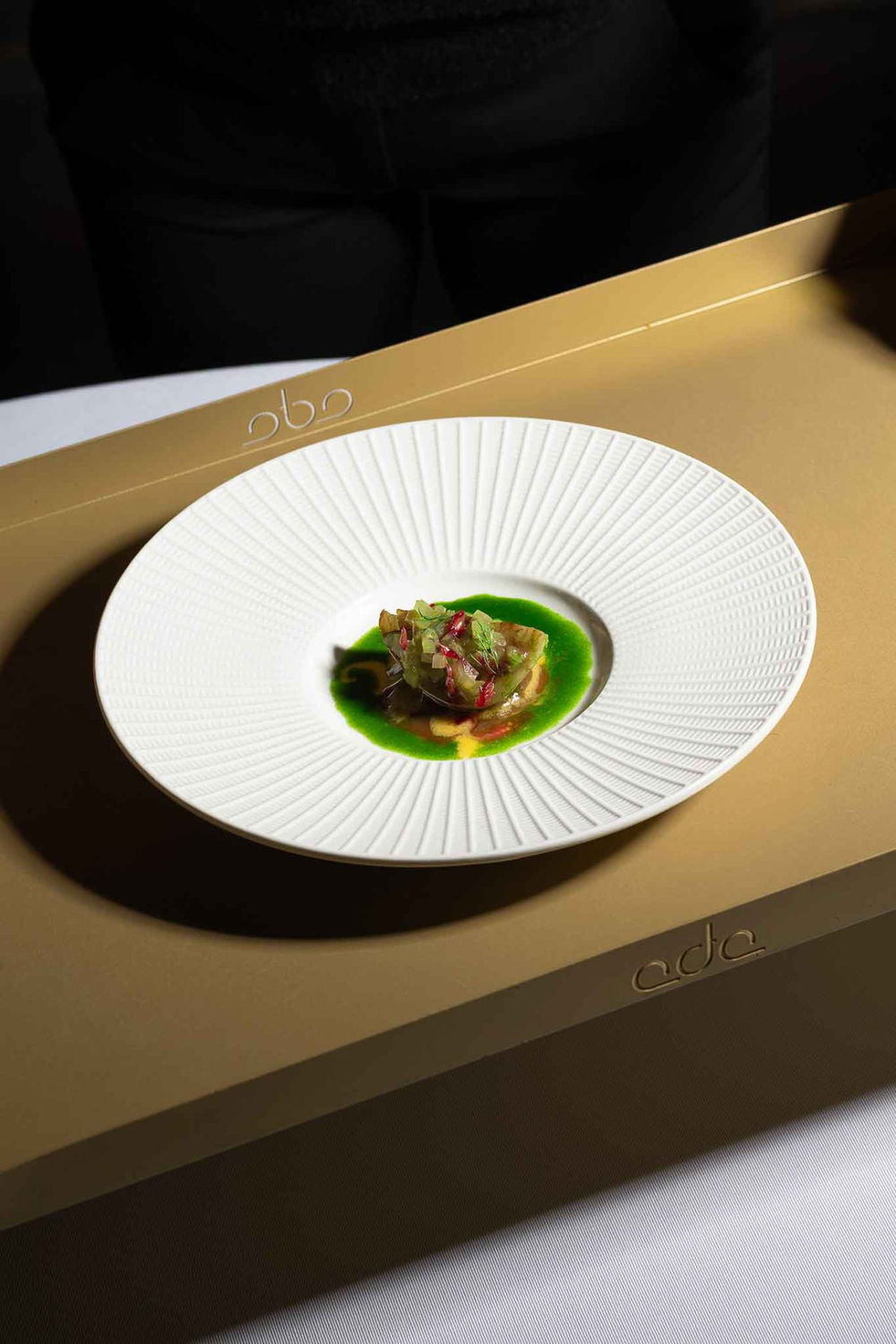 Cioccolato nel Bosco è un omaggio alla tavoletta di cioccolato dell’infanzia. Una sfoglia all’uovo racchiude un ripieno di cinghiale e caprino, mentre una foglia d’argento edibile richiama la carta stagnola. Il piatto è completato da un consommé di cinghiale e nibs di cacao.
