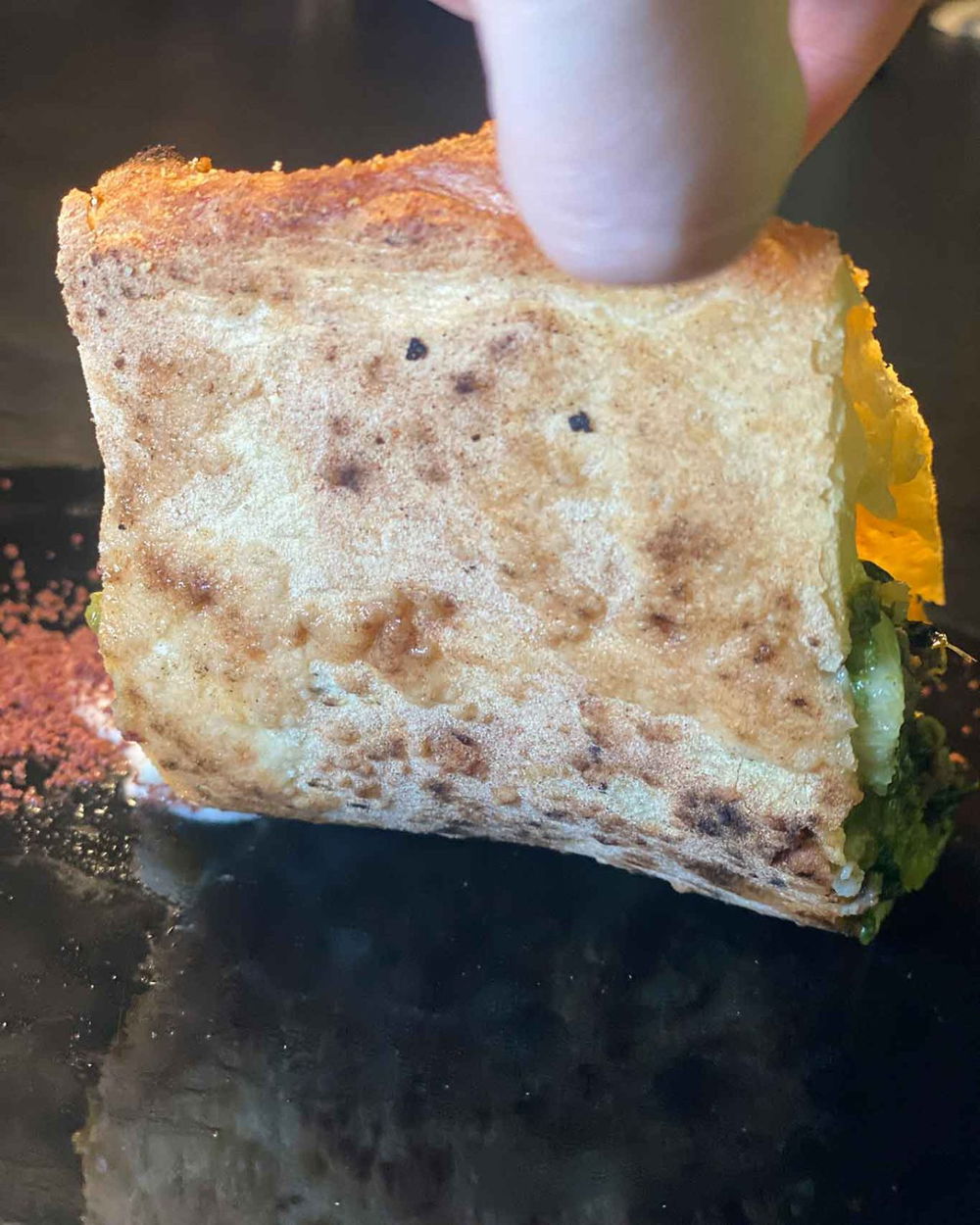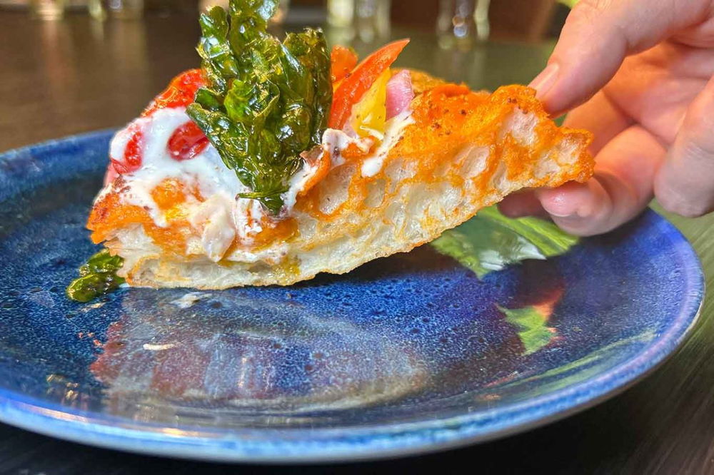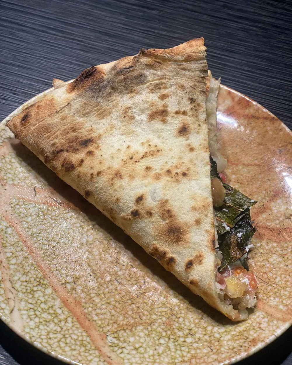 Il ripieno affascina per la crosta super crispy conferita dal pecorino che regge anche dopo il taglio. Estetica che premia e penalizza al contempo: la scelta di servire lo “spicchio” in modo da sottolinearne la struttura è contrastata dalla disposizione della farcia che è su un solo lato. Per quanto apprezzabile l’idea, ci sembra strano – molto strano – che avendo ai forni il miglior fornaio di Italia si opti per una cottura che appare (dopo l’assaggio) non perfetta. La croccantissima superficie esterna superiore si alterna ad un interno con troppa umidità che ammolla l’impasto fino alla parte esterna zuppa di liquidi. Mentre il morso risulta tenace.