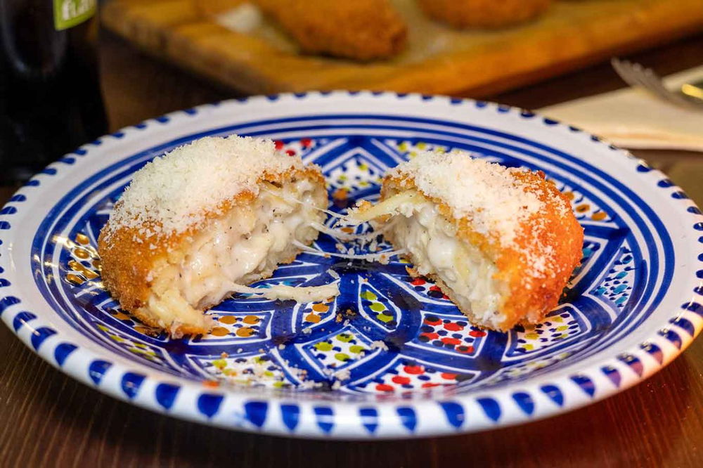 - Il supplì di casa Rotundo, risotto mantecato con salsa di pomodoro, basilico e il suo cuore di fiordilatte filante ( 3 €)